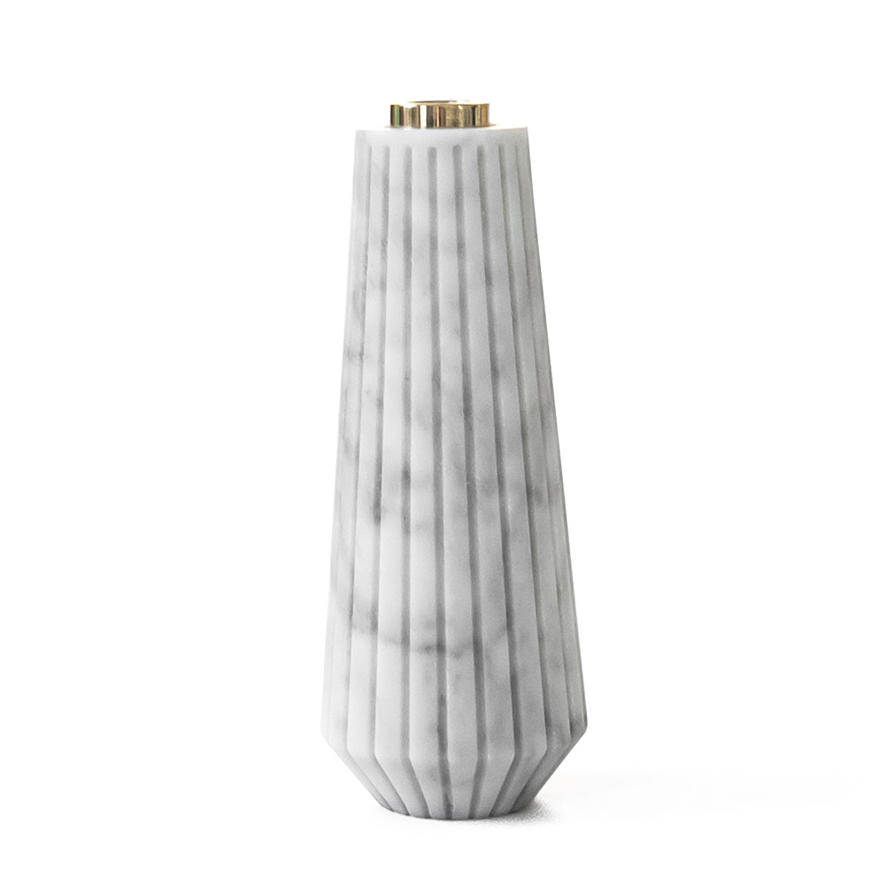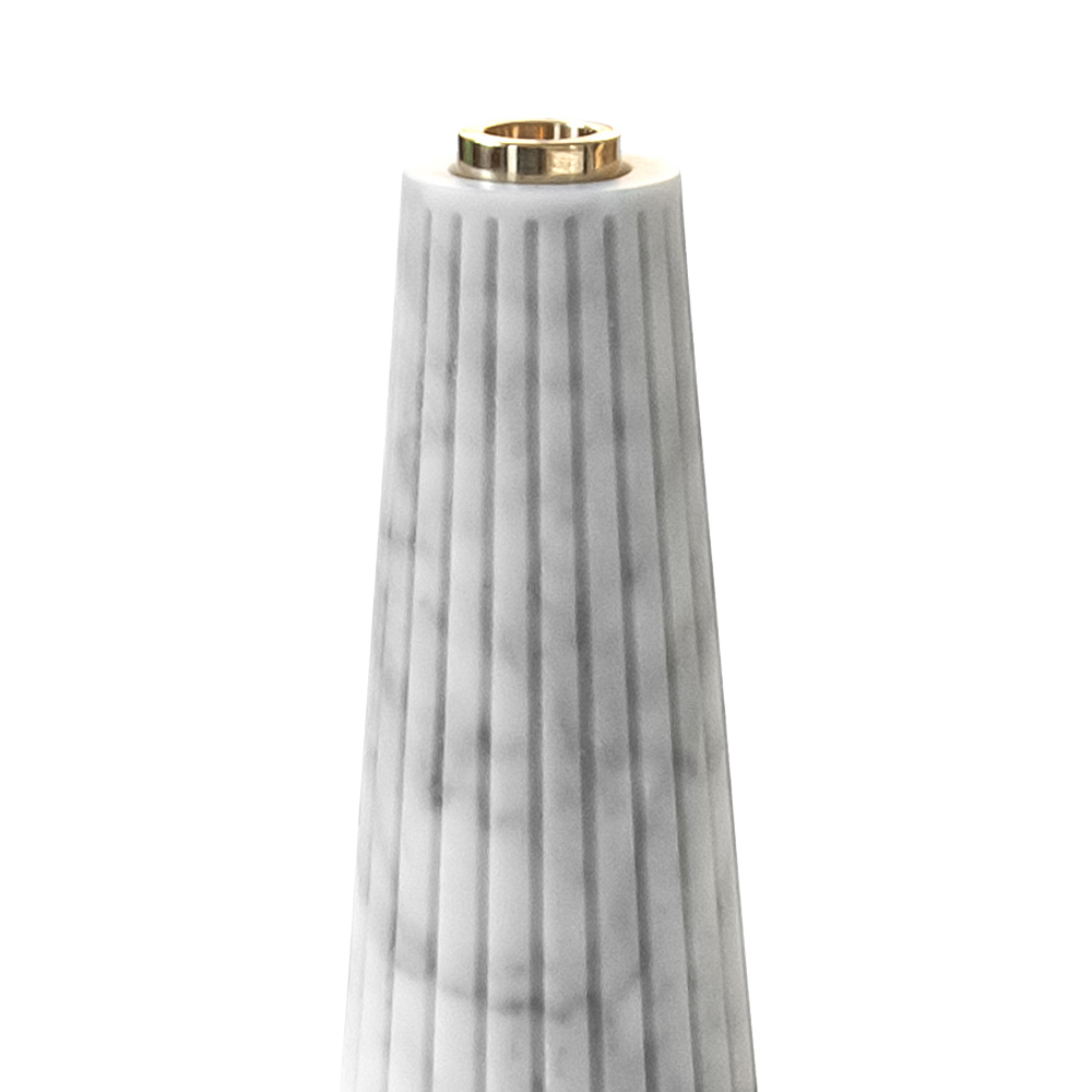 Suport de lumânare mic cu dungi din marmură albă de Carrara și alamă, fabricat în Italia.