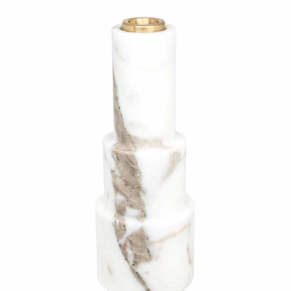 Suport pentru lumânări modern, înalt, din marmură albă de Carrara și alamă, fabricat în Italia.