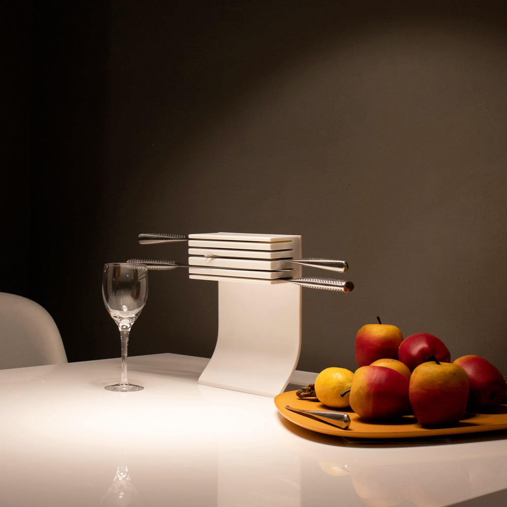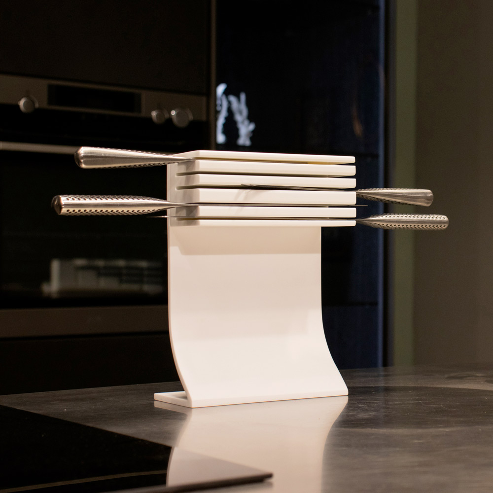 Suport cuțit în corian alb cu 5 lame, de înaltă calitate fabricat în Italia.