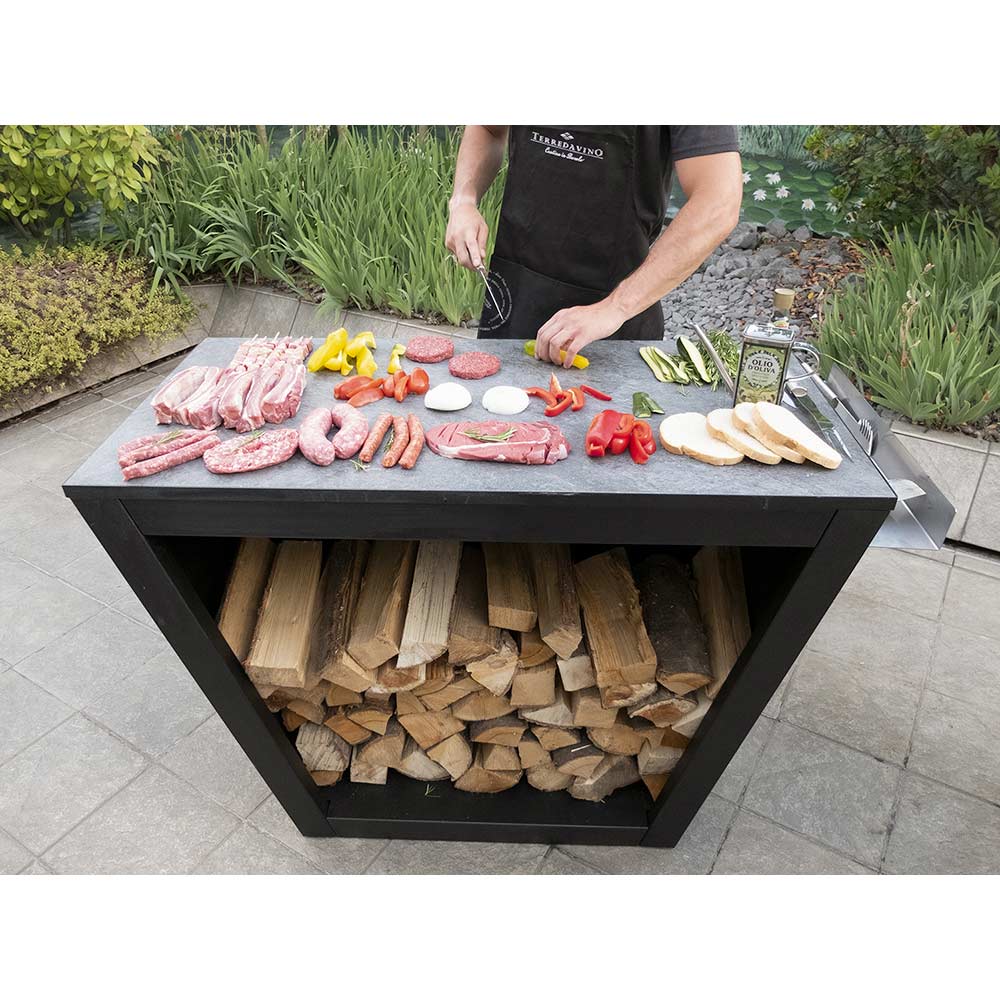 4 picioare reglabile din oțel inoxidabil. Blatul de lucru din gresie din porțelan are 90 cm înălțime și vă va permite un spațiu suplimentar unde puteți pregăti carne și legume pentru bucătărie sau grătar.