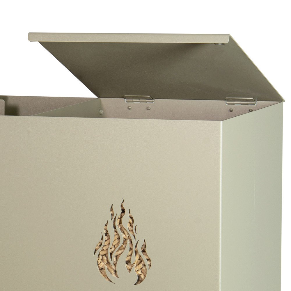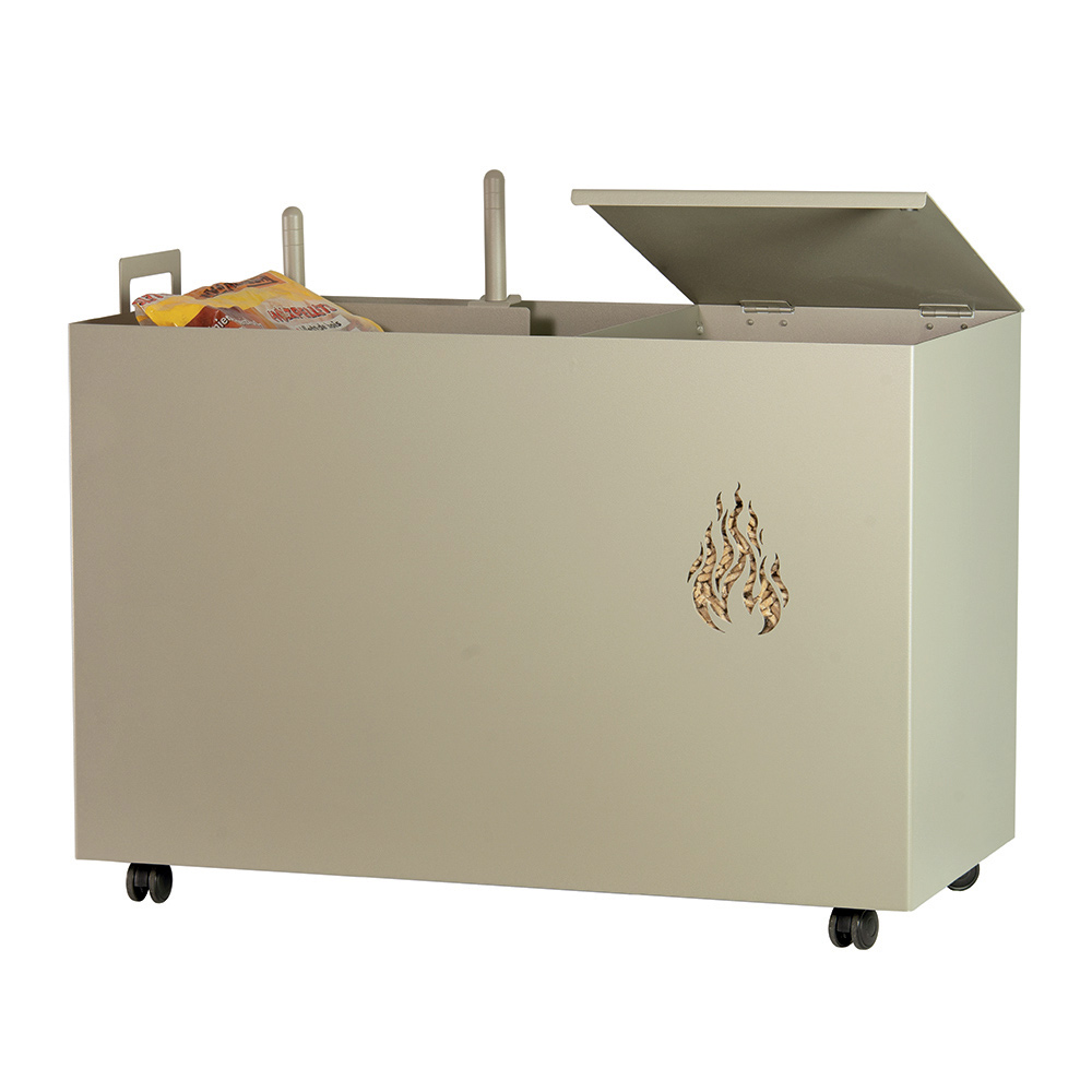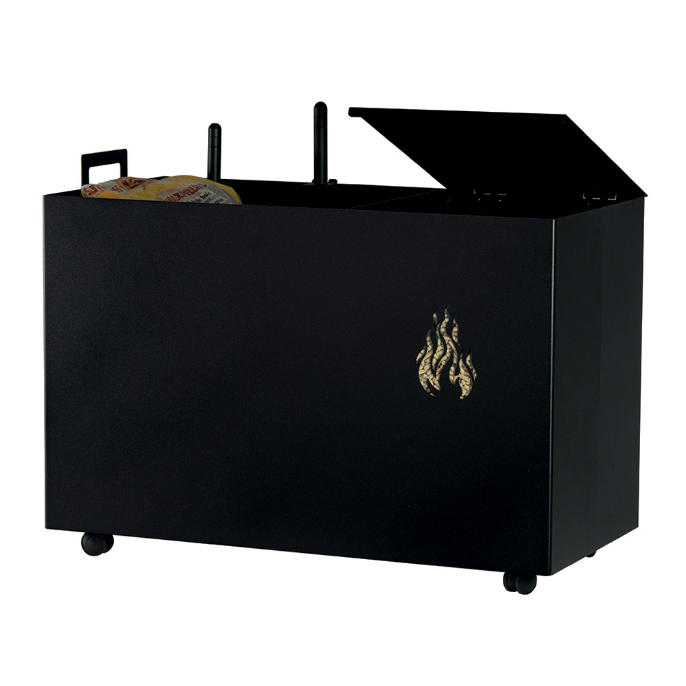 Acest cărucior cu peleți pentru șemineu este o soluție ideală pentru cei care caută o modalitate elegantă și practică de depozitare a peleților. Structura robustă și designul modern se potrivesc perfect în orice stil interior. Simbolul flăcării din față adaugă un detaliu decorativ care subliniază funcția căruciorului, făcându-l imediat recunoscut.