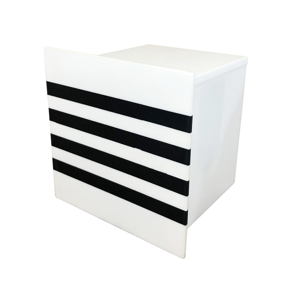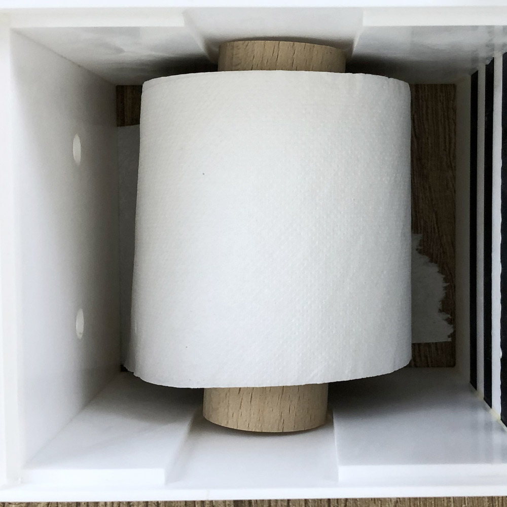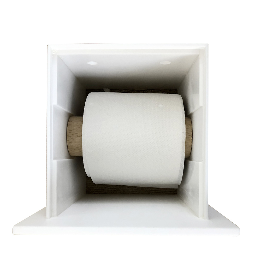 Suport pentru role de toaletă montat pe perete în corian alb sau cu inserții negre, realizat în design italian.