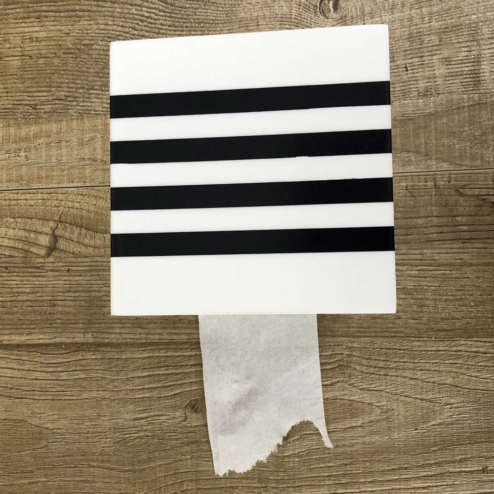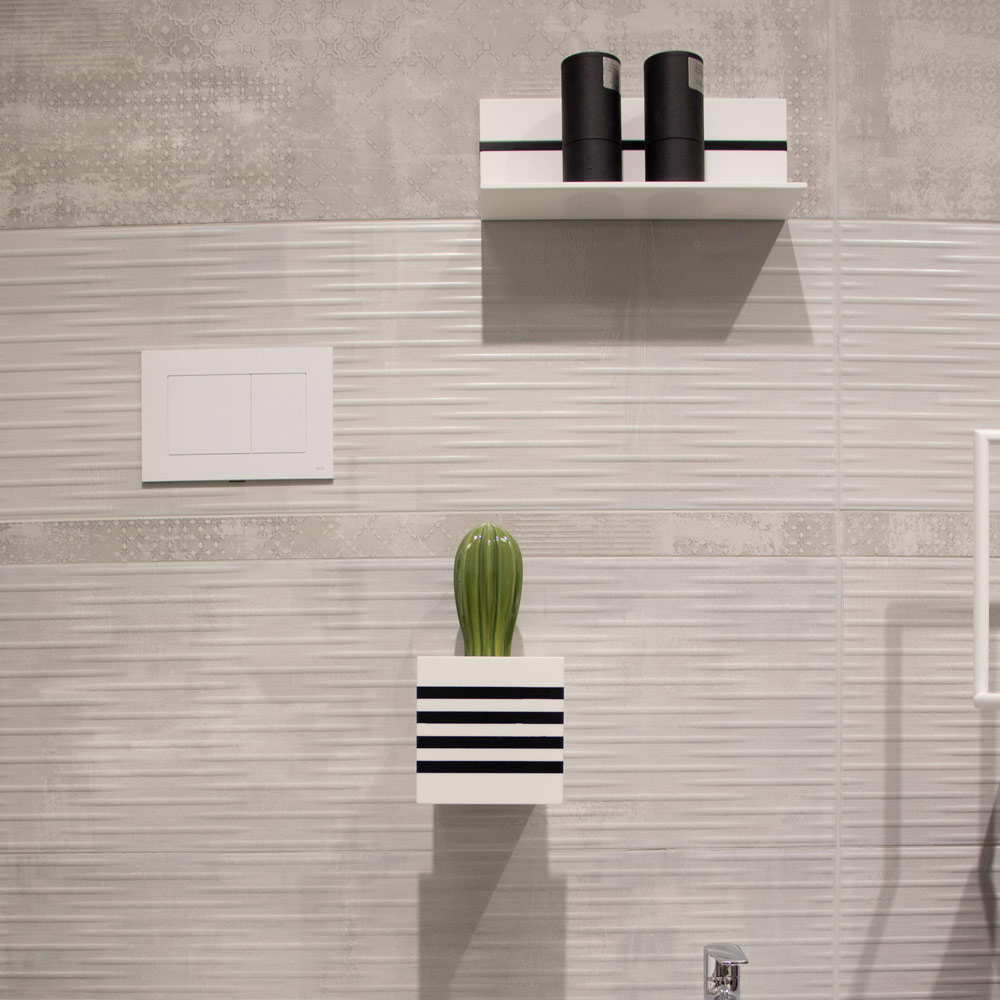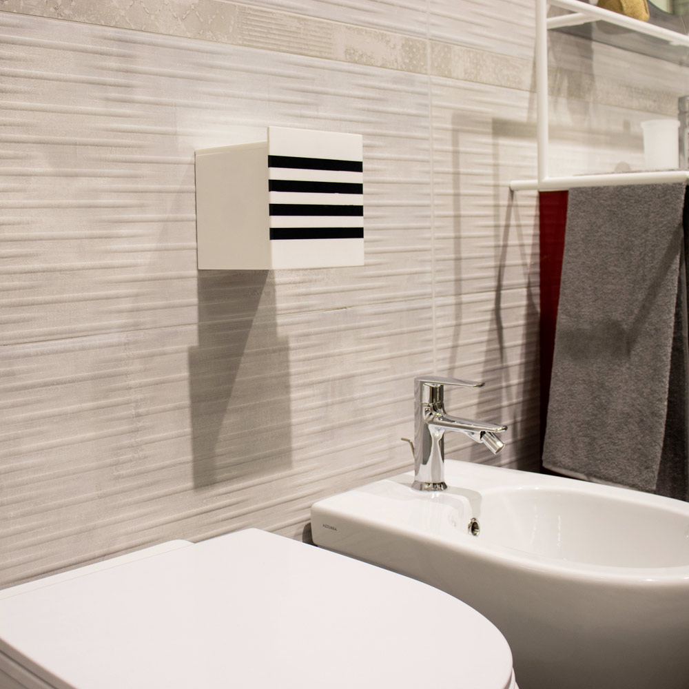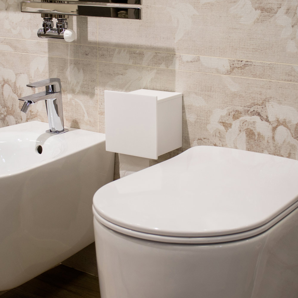 Alegeți suportul pentru role de toaletă montat pe perete, cu grosimea de 6 mm, pentru o atmosferă modernă și de lux realizată în întregime din corian alb sau alb cu inserții negre, un material igienic cu linii esențiale.