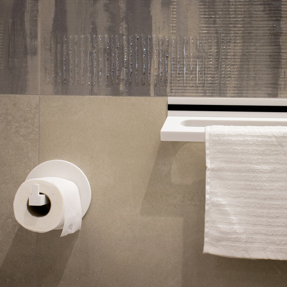 Alegeți acest suport pentru role pentru toaletă cu grosimea de 6 mm, cu știft frontal alb și disc de protecție de perete, ca accesoriu pentru baie pentru o atmosferă modernă și de lux realizată în întregime din Corian, un material igienic cu linii esențiale.
