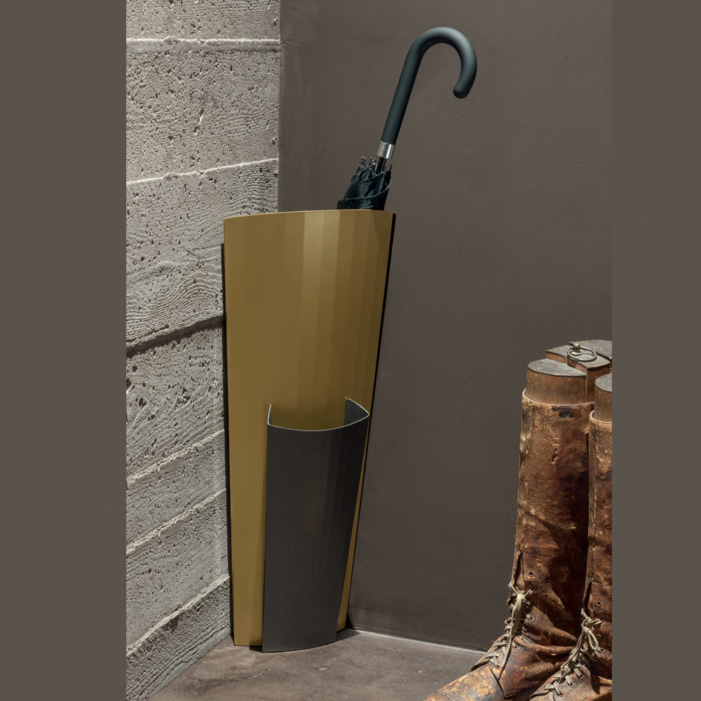 Made in Italy. Suport pentru umbrele cu un design original si functional. Are o structură din tablă vopsită în negru și auriu, înfrumusețată cu o manoperă fațetată care amintește de un pliu elegant. Acest suport pentru umbrelă nu numai că își îndeplinește funcția principală în mod eficient, dar adaugă și o notă de eleganță și stil la intrarea casei sau a biroului dumneavoastră datorită designului său distinctiv și materialelor de înaltă calitate utilizate în construcția sa.