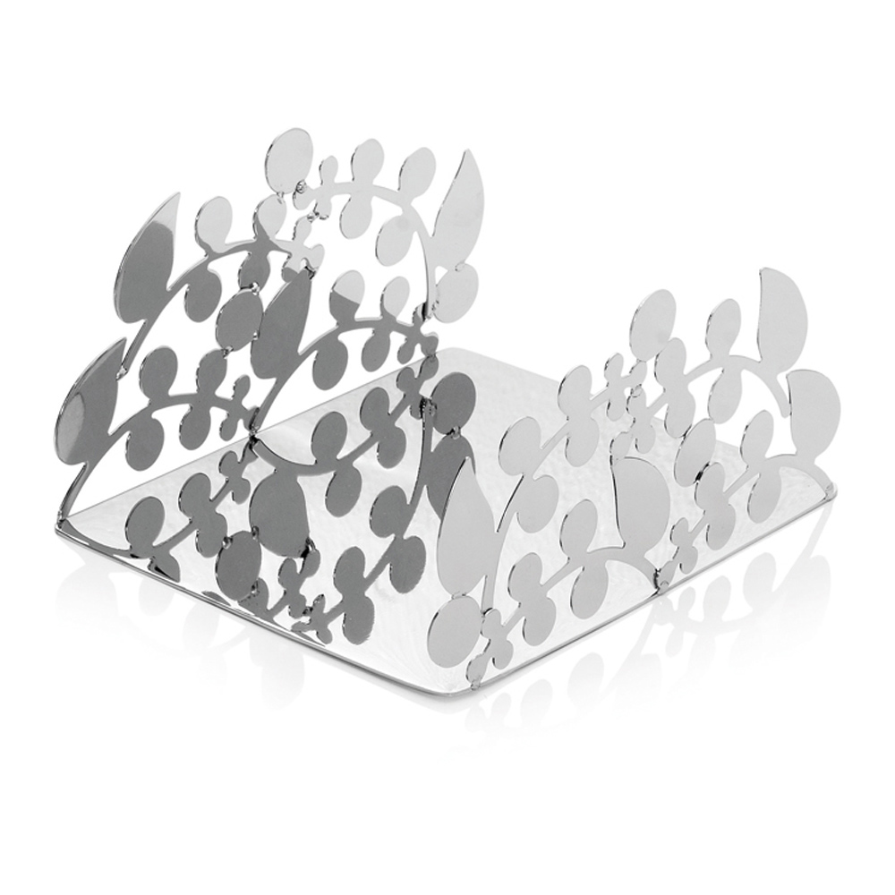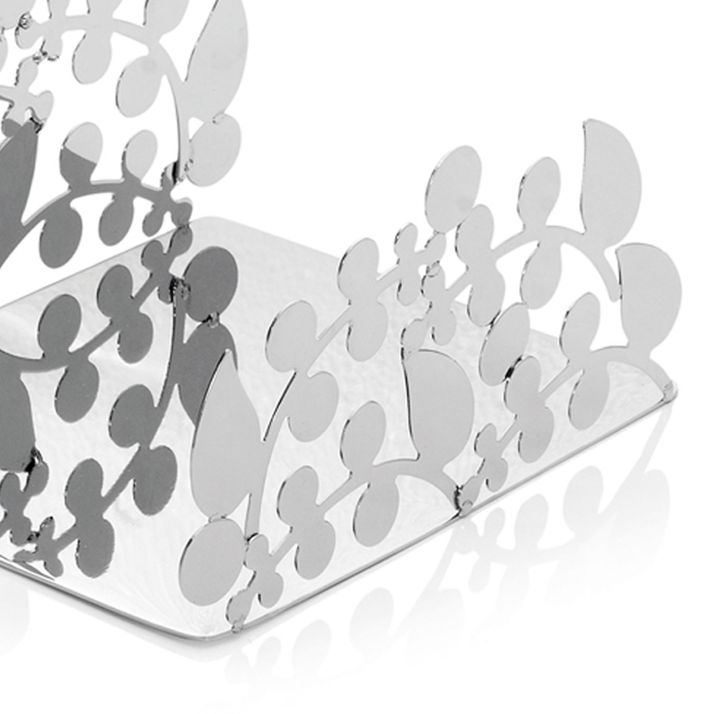 Acest suport pentru șervețel are un design dreptunghiular sofisticat și elegant , realizat în întregime din metal argintiu cu decorațiuni naturaliste.