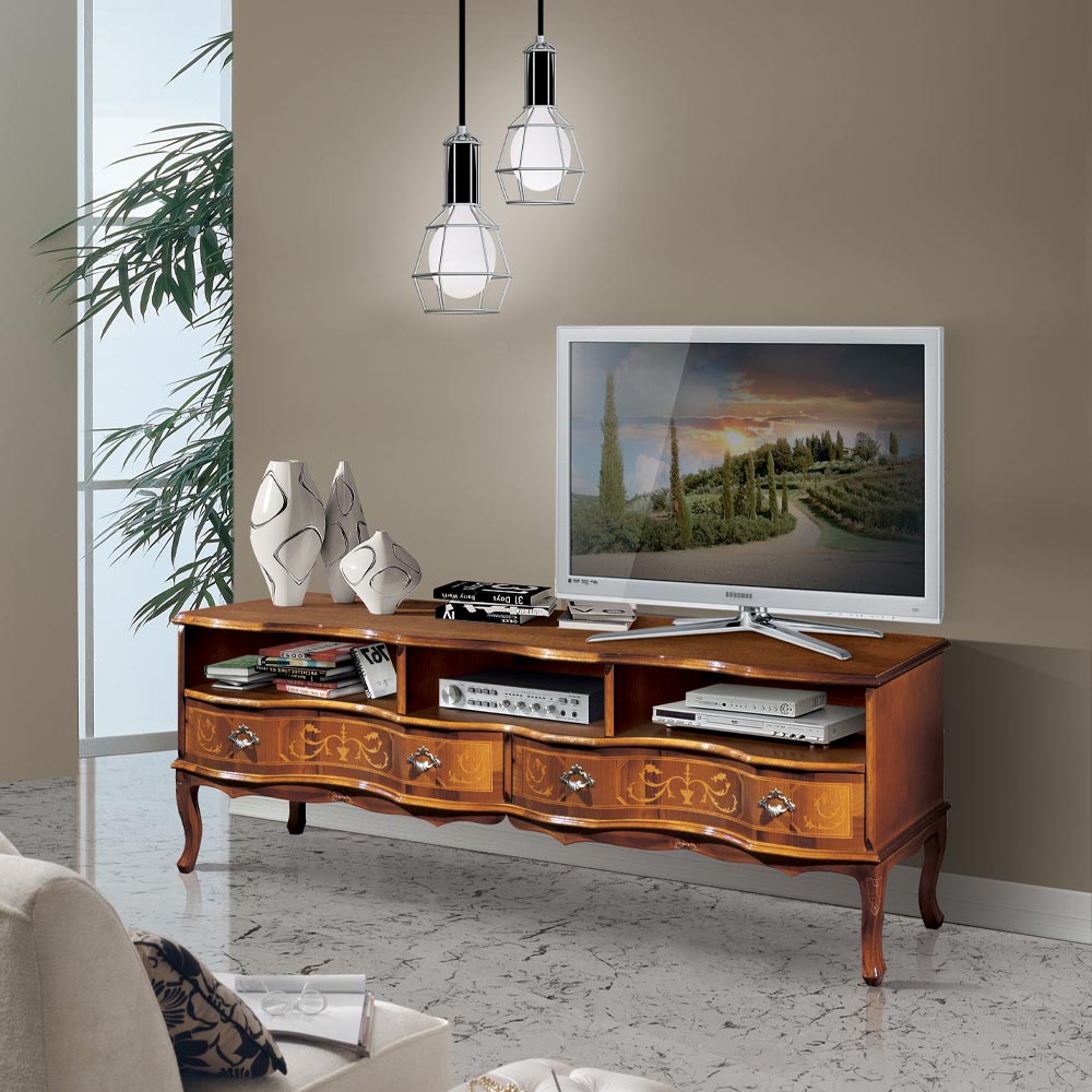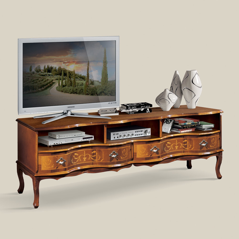Comodă TV din lemn, în stil clasic, cu compartimente și sertare, fabricată în Italia.