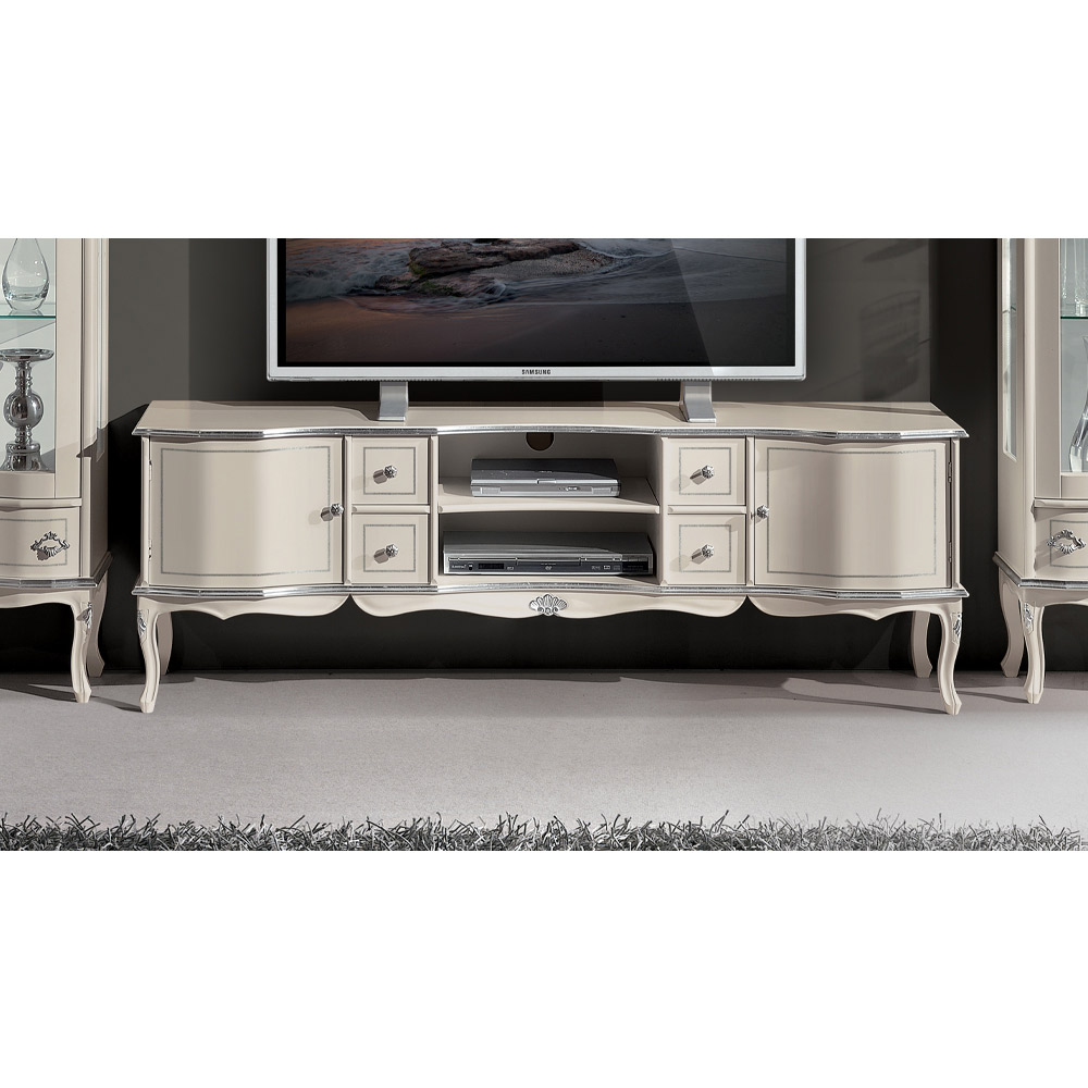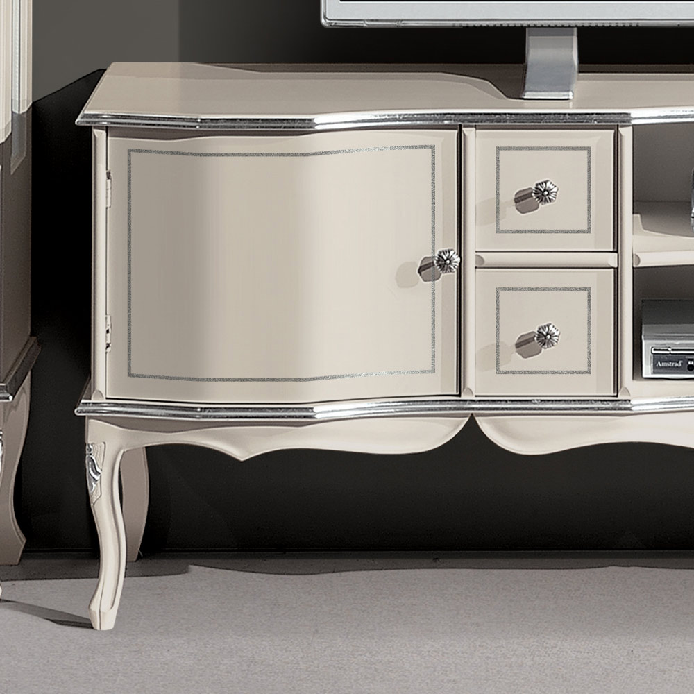 Comodă TV în stil clasic pentru living, cu 2 uși, 4 sertare și 2 compartimente. Stilul și măiestria care caracterizează lucrarea reies în această piesă de mobilier somptuoasă, realizată din lemn fin alb cu detalii argintii , un accesoriu rafinat capabil să pună în valoare mediul în care este amplasată. Fabricată în întregime în Italia și lucrată manual de meșteri pricepuți , este finisată cu măiestrie și gust pentru eleganță. Producția se realizează folosind materiale de calitate , iar prelucrarea este realizată manual , cu cea mai mare grijă și profesionalism care distinge produsele Made in Italy .