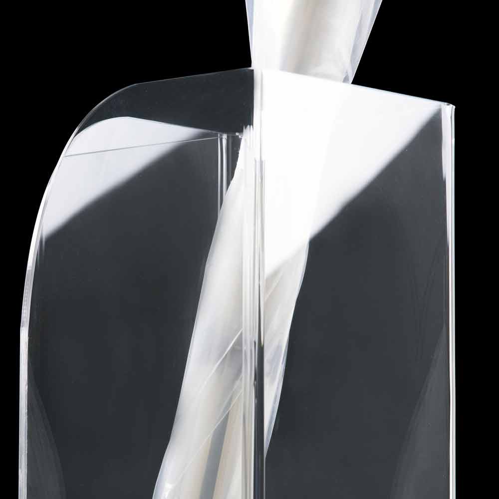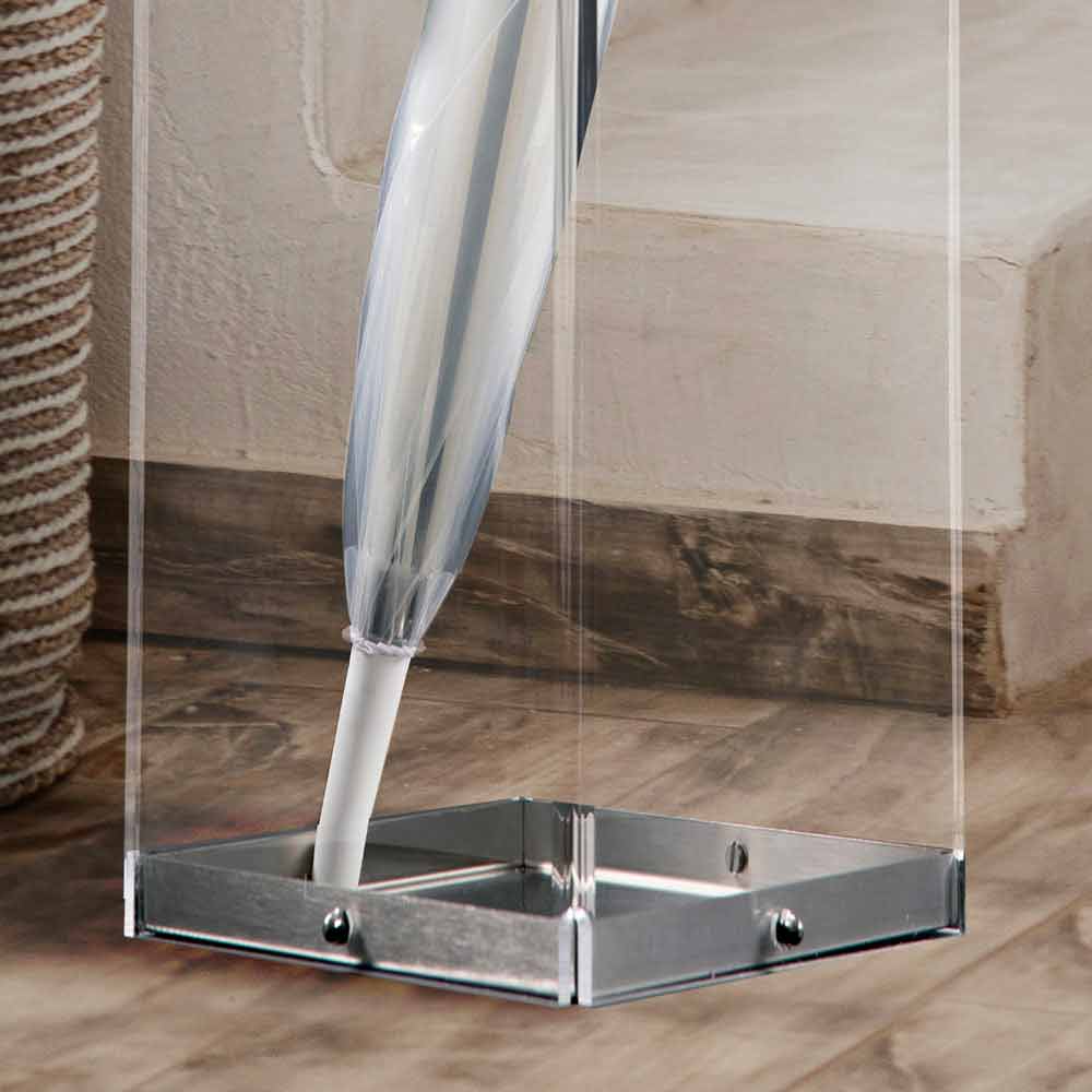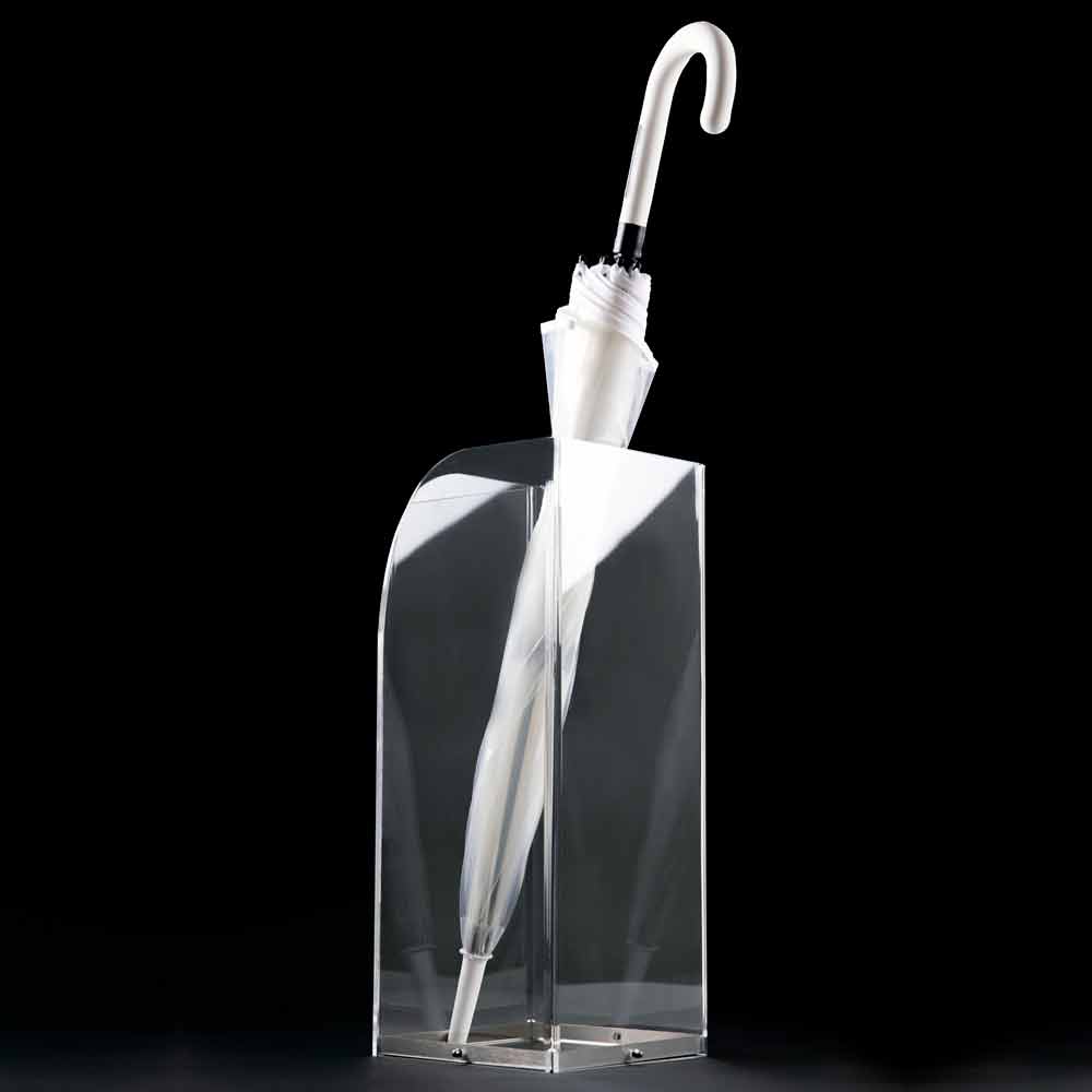 Suportul pentru umbrele din plexiglas transparent se caracterizează prin designul său minimal și complet neted, fără bibelouri sau decorațiuni, pentru a evidenția liniile pure și simple cu o bază din oțel inoxidabil.