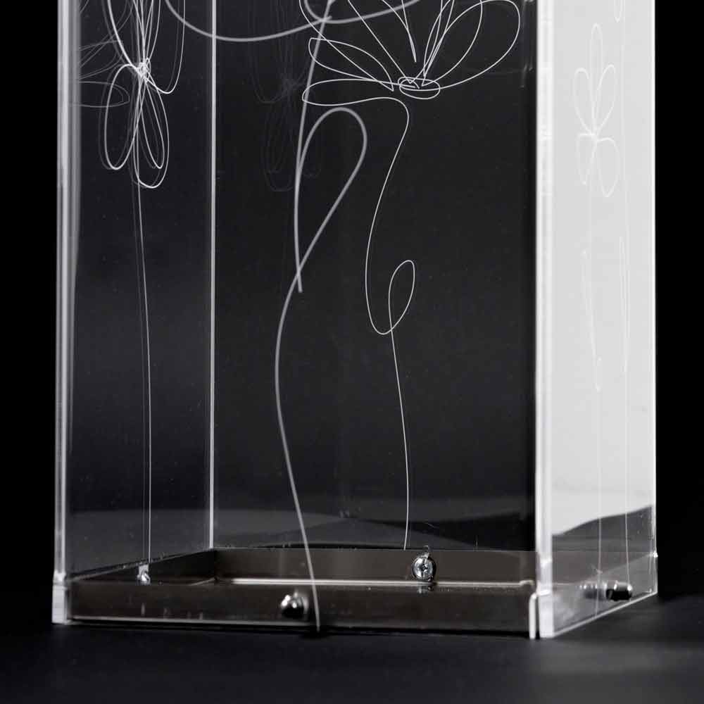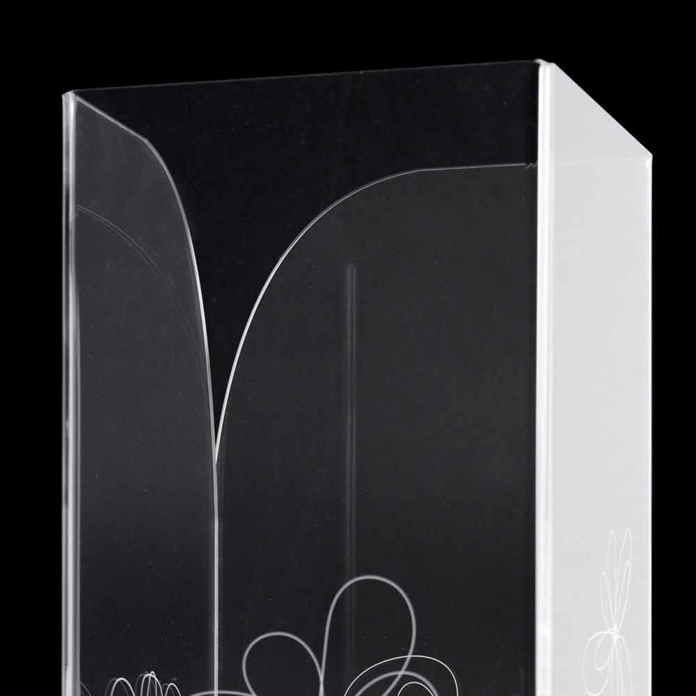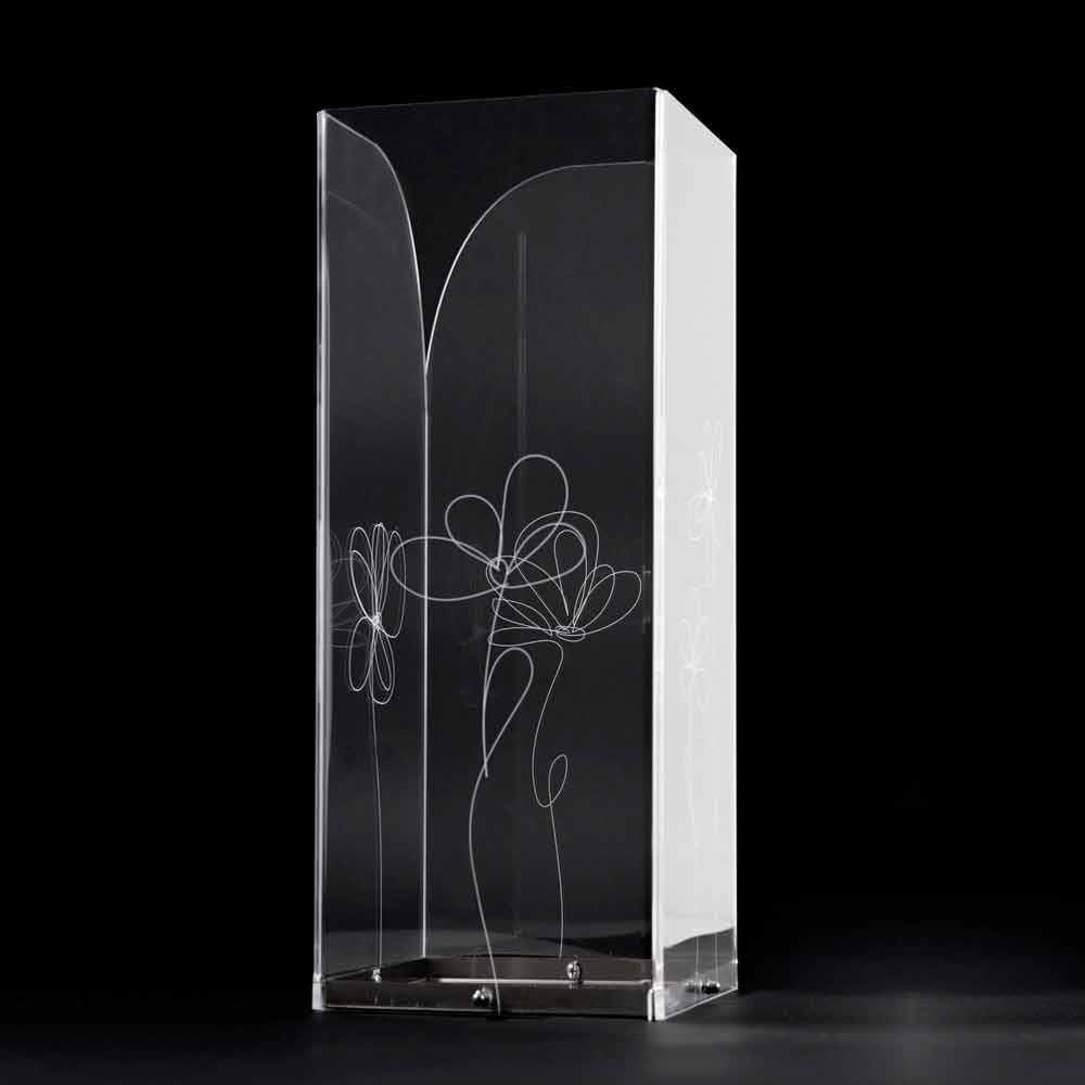 Suport umbrelă din plexiglas transparent care se caracterizează prin decorațiuni florale marcate cu laser, cu un stil stilizat cu bază din oțel inoxidabil.