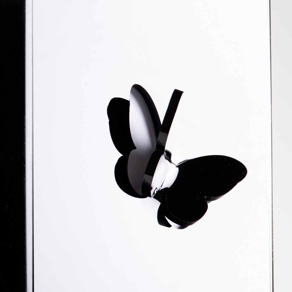 Suportul pentru umbrele din plexiglas negru se caracterizează prin reprezentarea ramurilor de iarnă marcate cu laser și a fluturilor decorate tridimensional și a bazei din oțel inoxidabil.