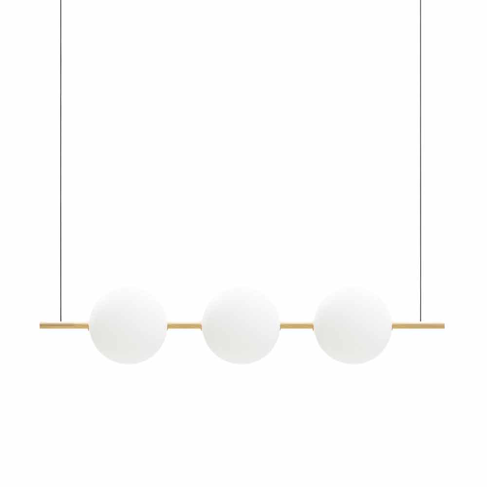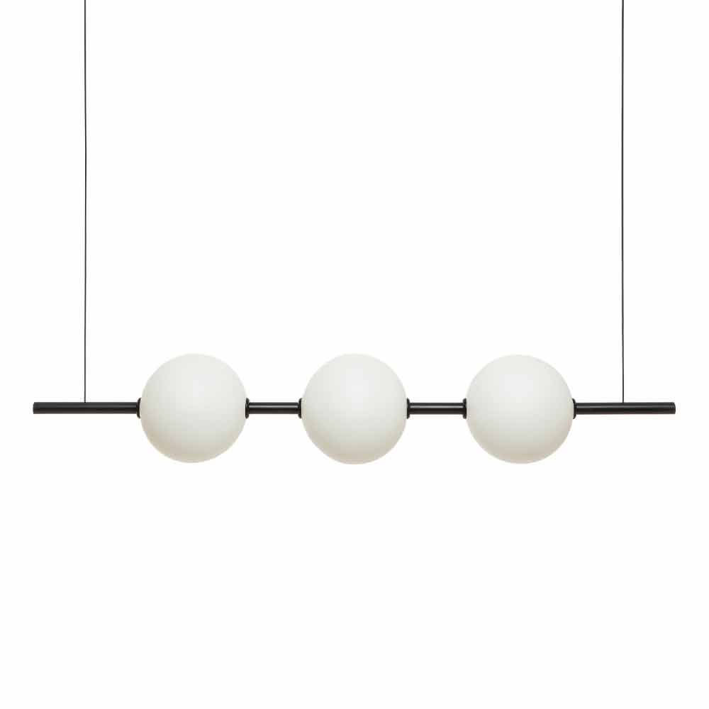 Lampă suspendată din alamă neagră sau periată cu trei sfere de sticlă borosilicată, fabricată în Italia.