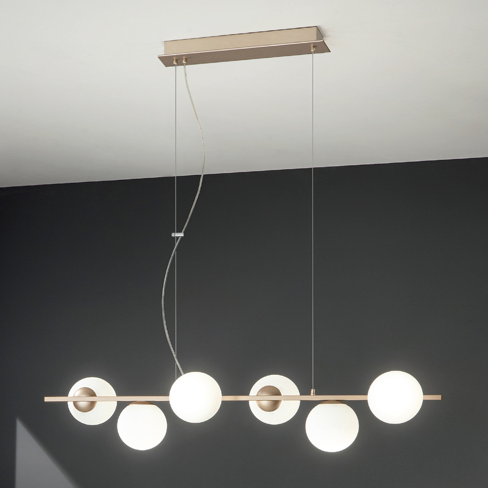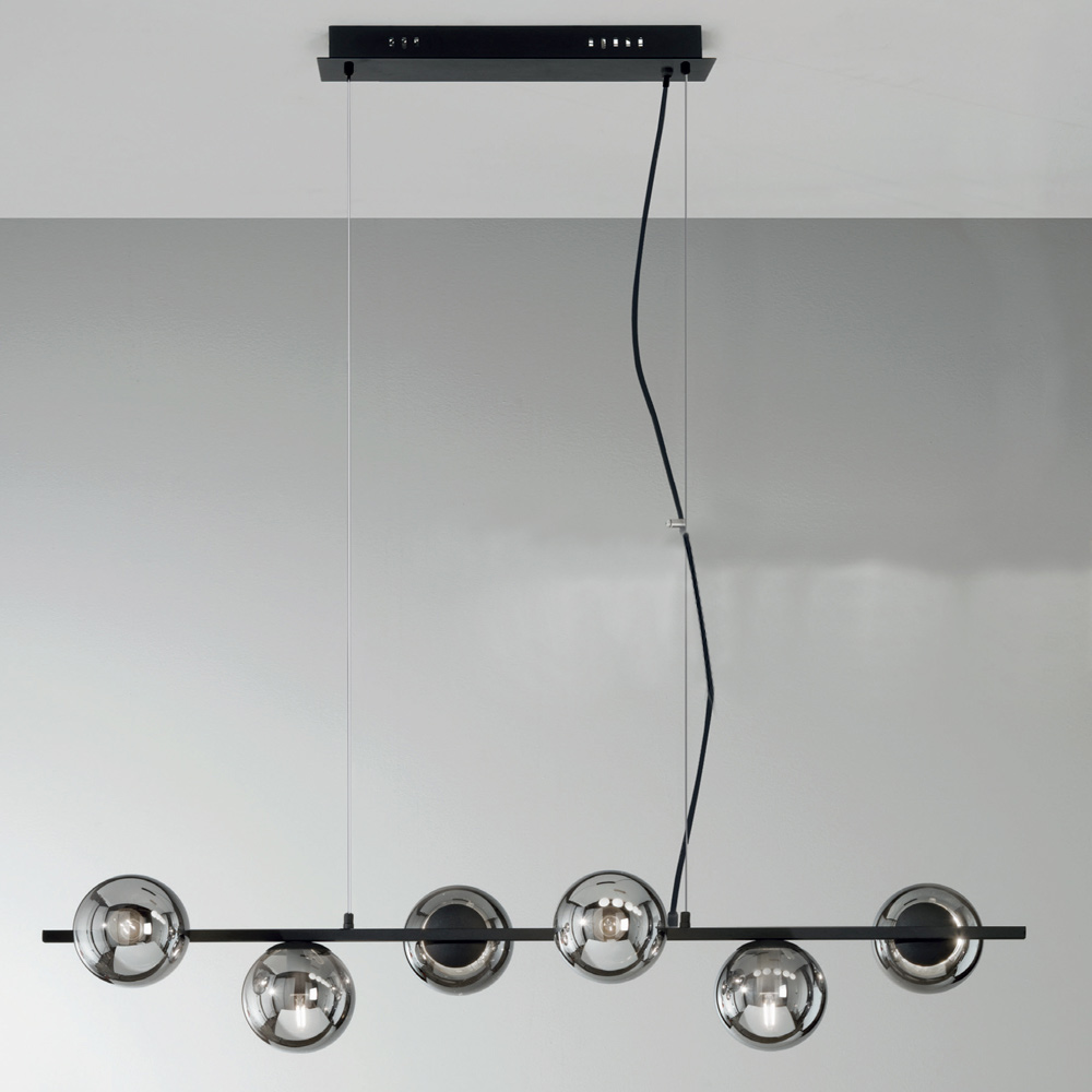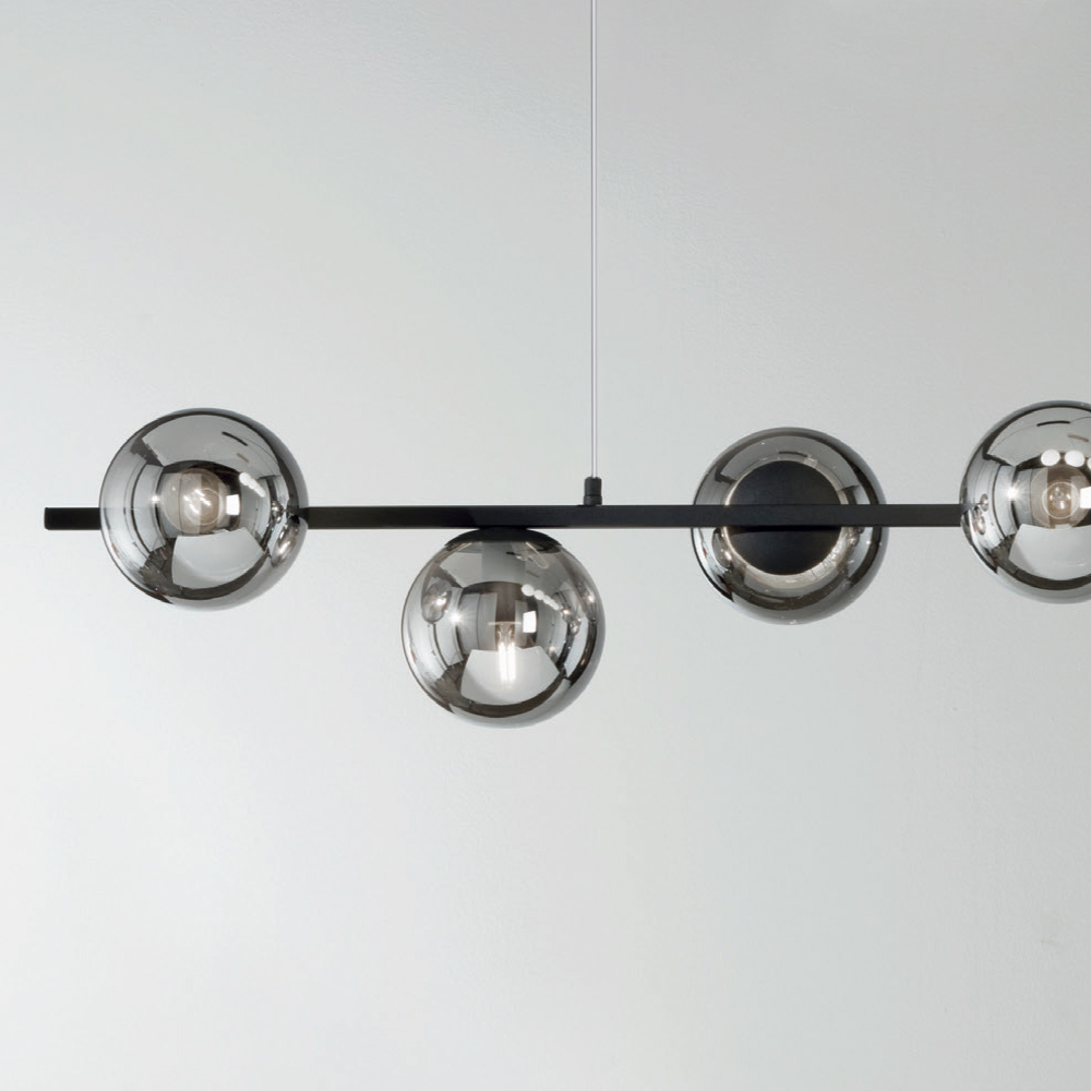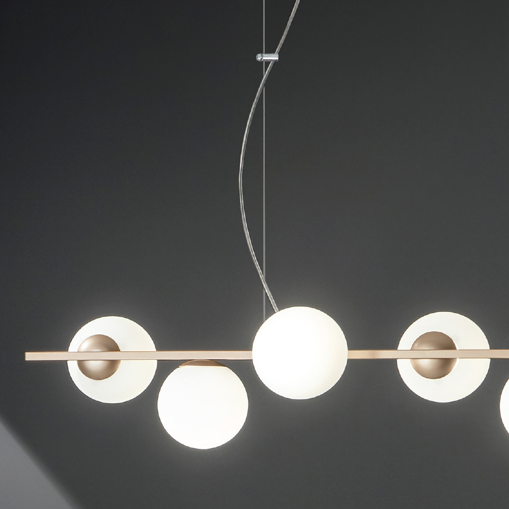difuzoare sferice din sticla suflata completate cu cabluri reglabile pe inaltime. Din combinația perfectă dintre atingerea modernă a metalului și eleganța atemporală a sticlei suflate ia