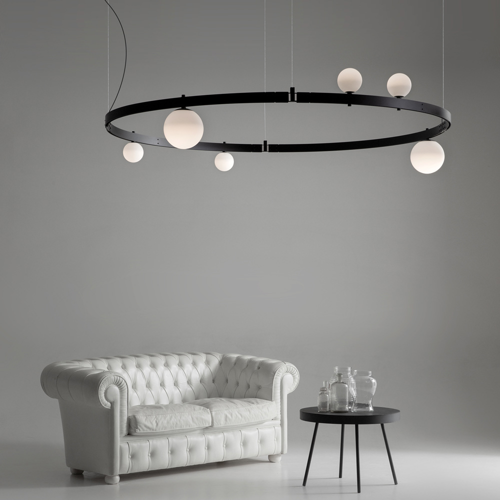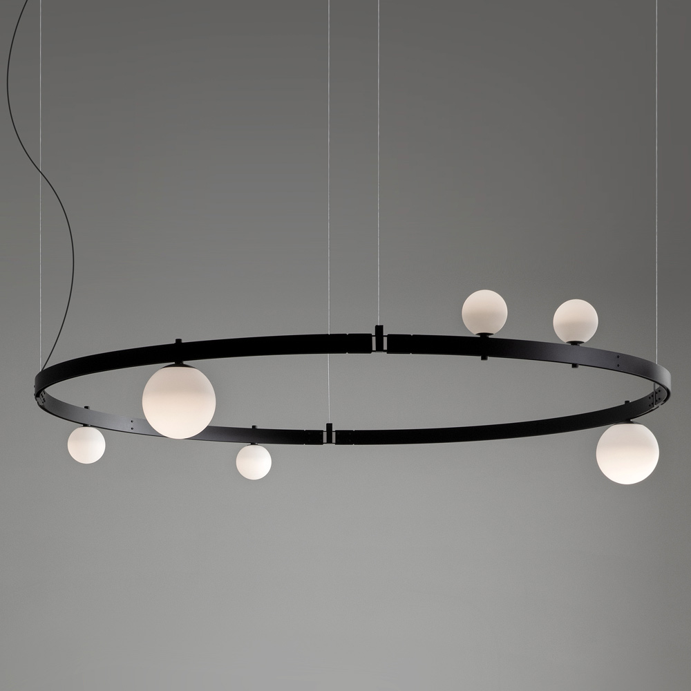 Bara circulară portantă amintește de structurile inginerești din trecut, iar structurile modulare electrificate susțin corpuri de iluminat ( sfere de sticlă suflată de două dimensiuni diferite) care pot fi amplasate în cantitate și aranjare liberă, fără utilizarea cablurilor de alimentare electrică, pentru libertate maximă de expresie.
