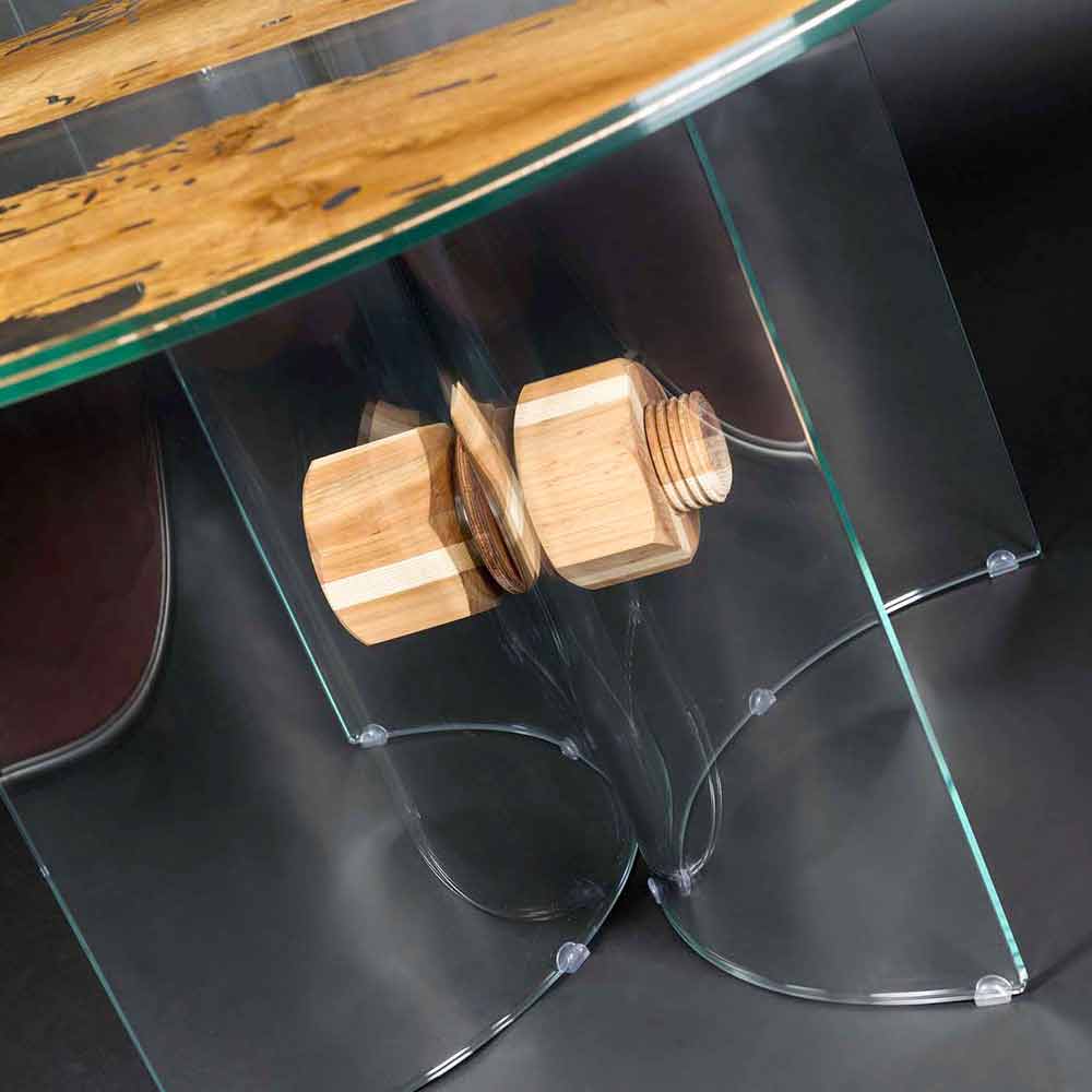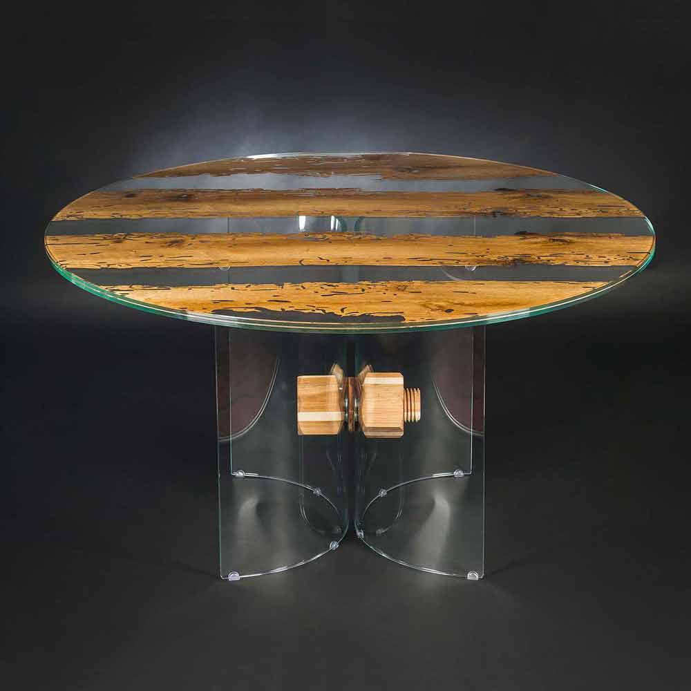design simplu și elegant, formă rotundă și unic și inimitabil potrivite pentru orice tip de mobilier de masă. În ea lemnul de „Briccole“ și sticla se topesc într-o îmbrățișare caldă și indisolubilă. O caracteristică unică a acestui tabel rezidă în baza sa realizat din sticlă curbată unite printr-un șurub și o piuliță de design, realizate cu diferite lemn într-o prelucrare fină de cabinetry artizanale.