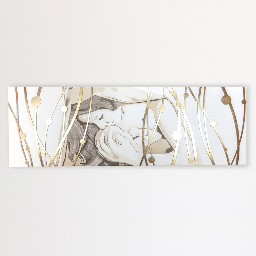 Panoul decorativ este realizat folosind tehnica de marcare cu laser. Acesta din urmă se vede în trăsăturile mamei și ale copilului și în părul des care încadrează cele două fețe. Panou din lemn lacuit alb mat cu marcare cu laser, o tehnica speciala care creeaza un basorelief pe materiale. Acest produs cu un stil unic si atemporal este perfect pentru a conferi incaperii in care este amplasat o atmosfera rafinata si de neuitat datorita finisajelor si designului. delicatețea sărutului este înfățișată cu mare atenție și precizie pentru a trezi o emoție profundă în privitor. Cadru rod al măiestriei italiene în care figurile sunt desenate manual și apoi pictate cu lumina fasciculului laser, fără nicio risipă și respectând mediul înconjurător.