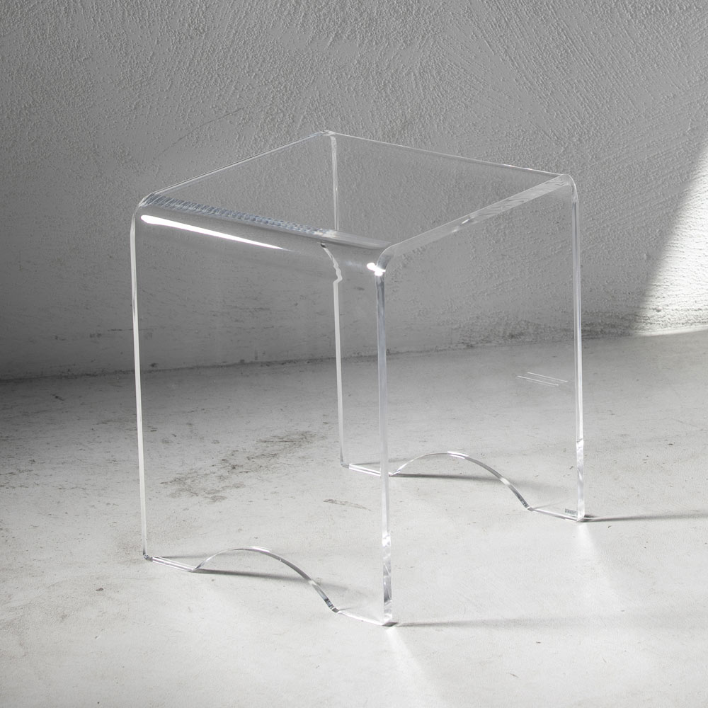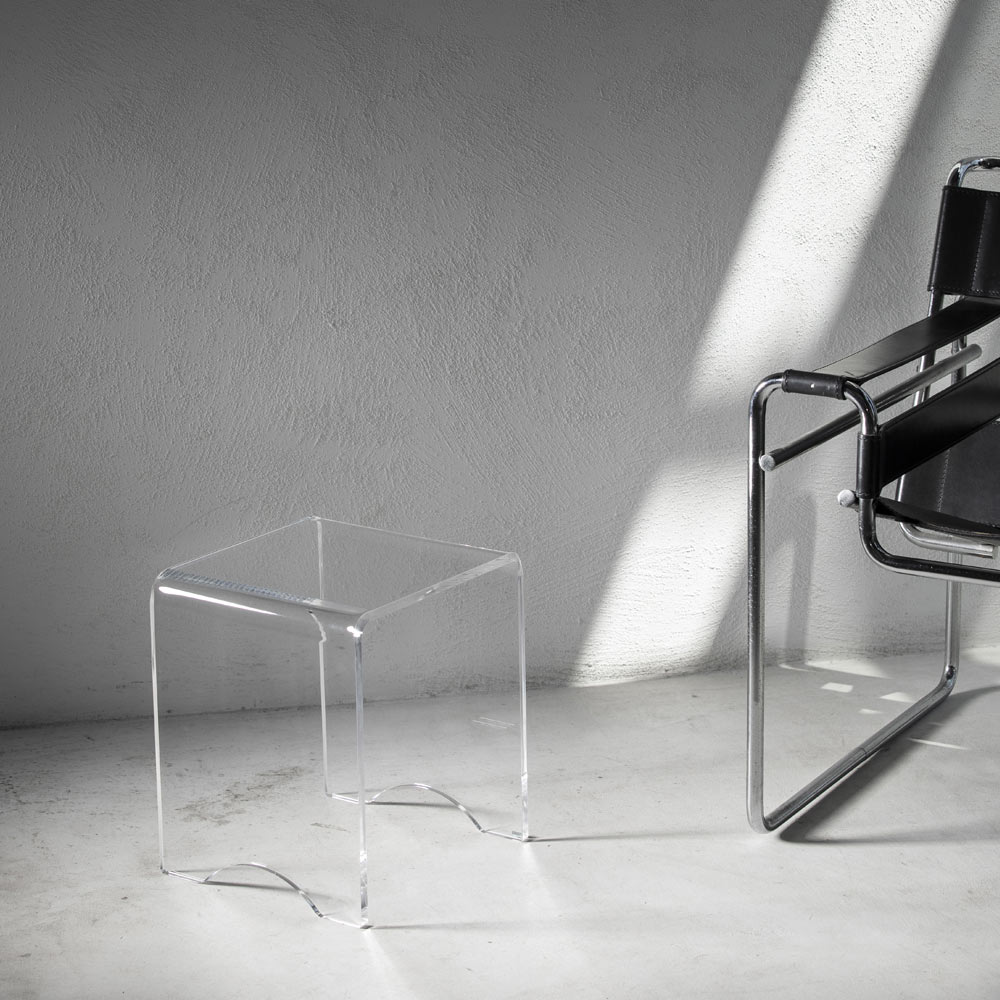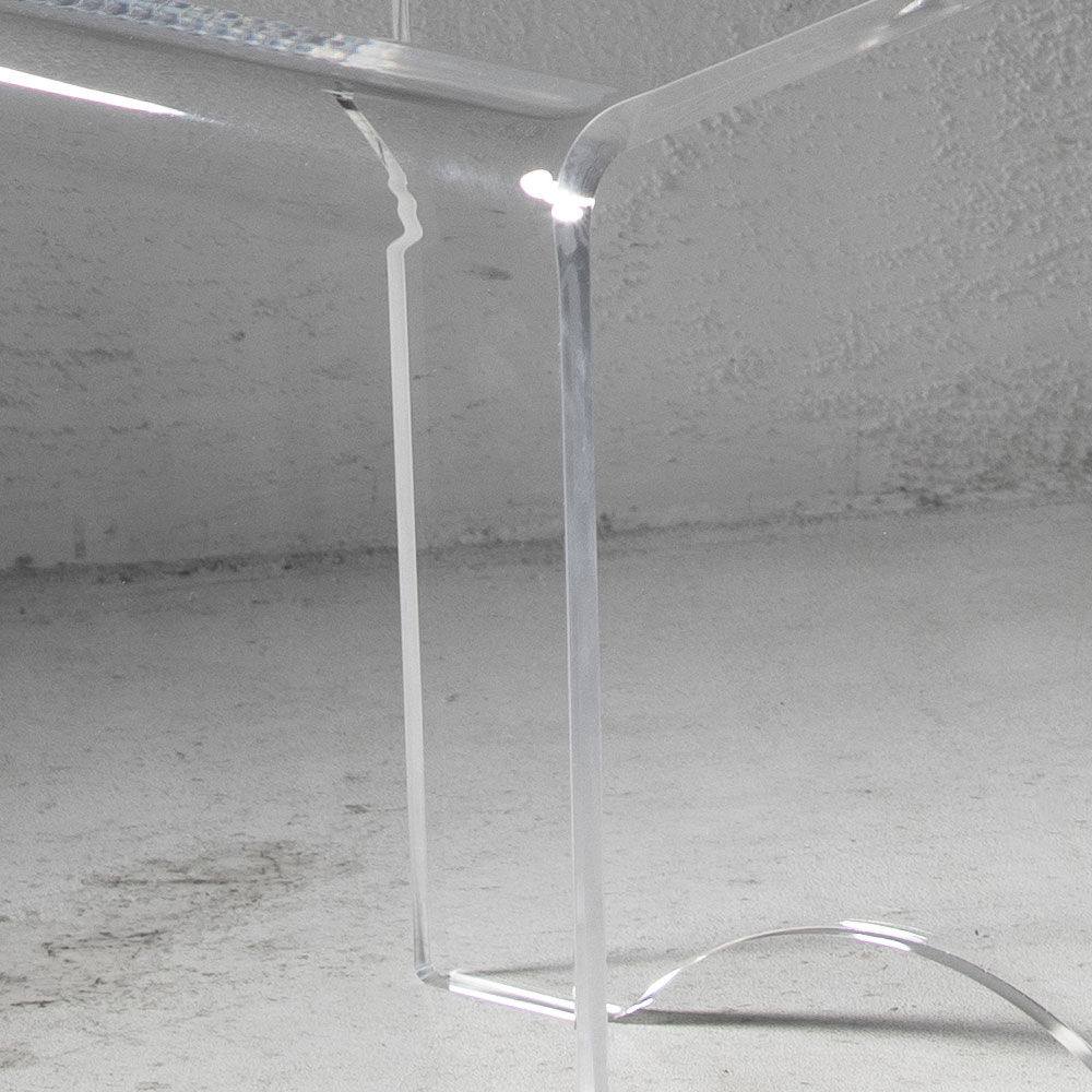 Acest scaun masuta de cafea are un design versatil cu linii pure si minimale si este realizat in intregime din cristal acrilic transparent taiat cu laser de -a lungul intregului perimetru ceea ce ii confera o stralucire extraordinara.