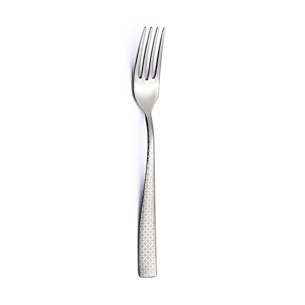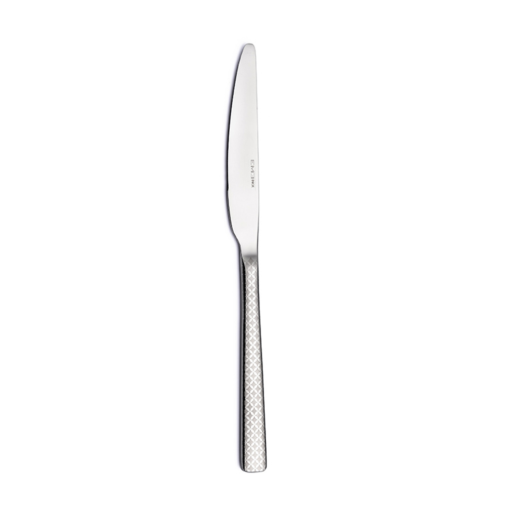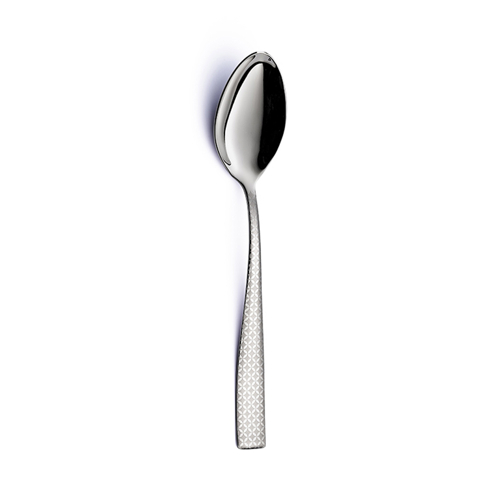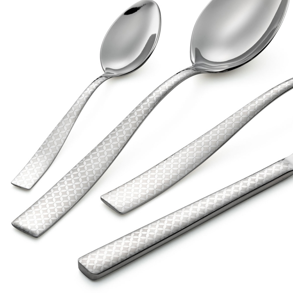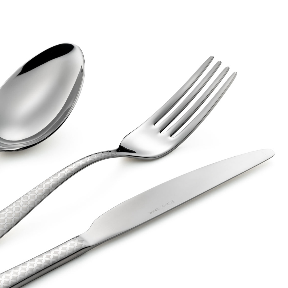 minimal al mânerelor largi, forma modelată și alungită a bolului lingurilor și sobrietatea furculiței evocă o idee de puritate și infinit.
