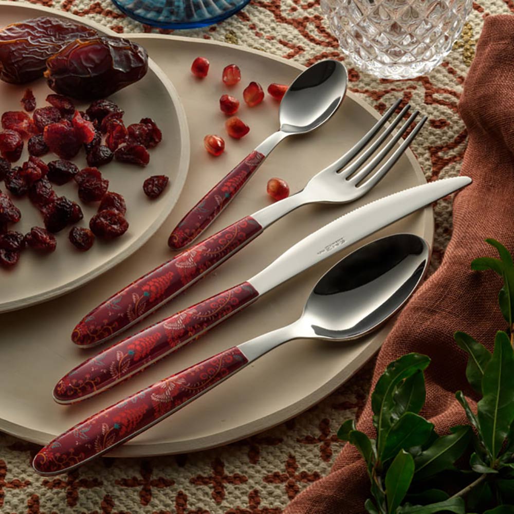Set tacâmuri din oțel inoxidabil și mâner din plastic colorat ghiloș, 24 de piese fabricate în Italia.