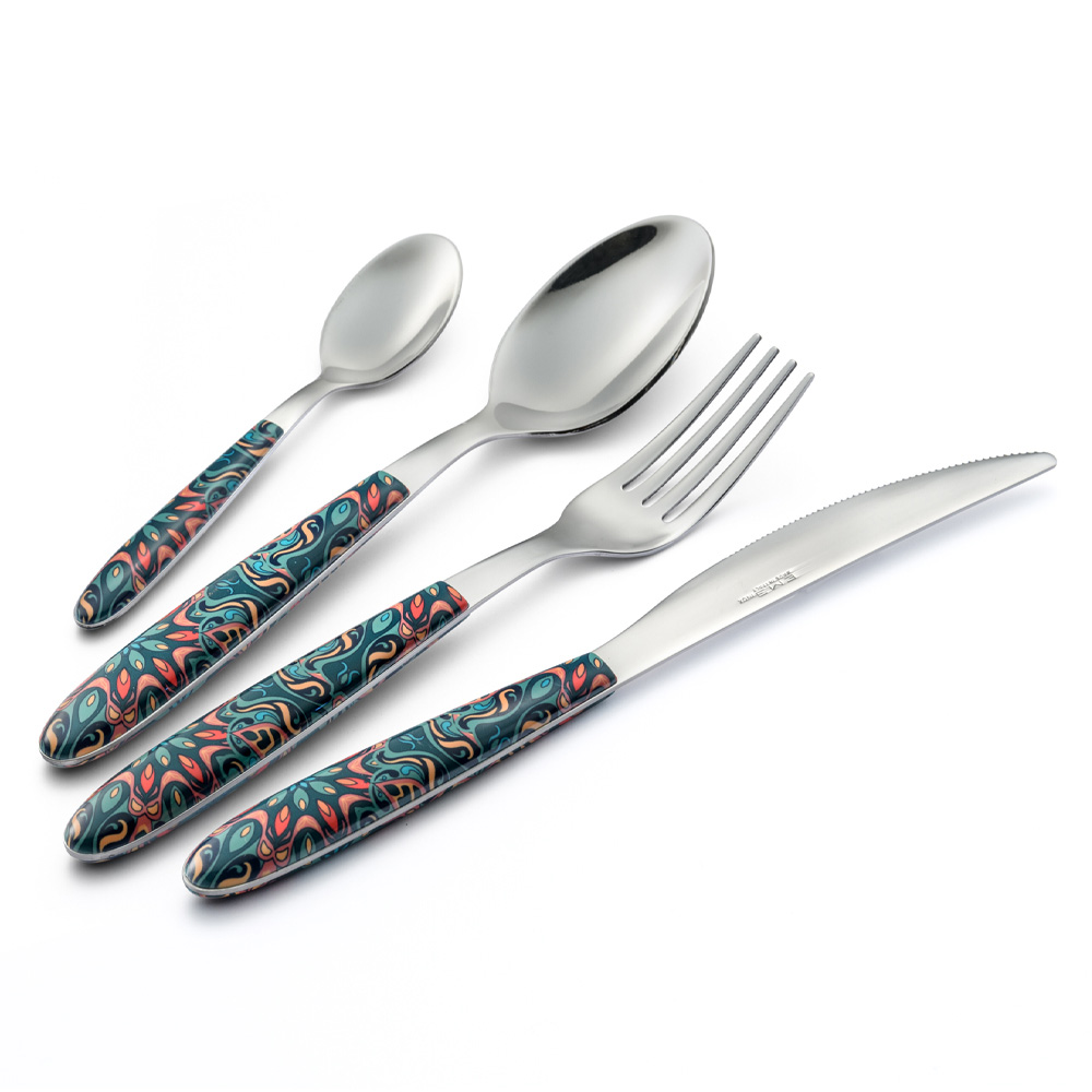 Set de tacamuri din otel inoxidabil si maner din plastic colorat cu decor floral, 24 de piese fabricate in Italia.