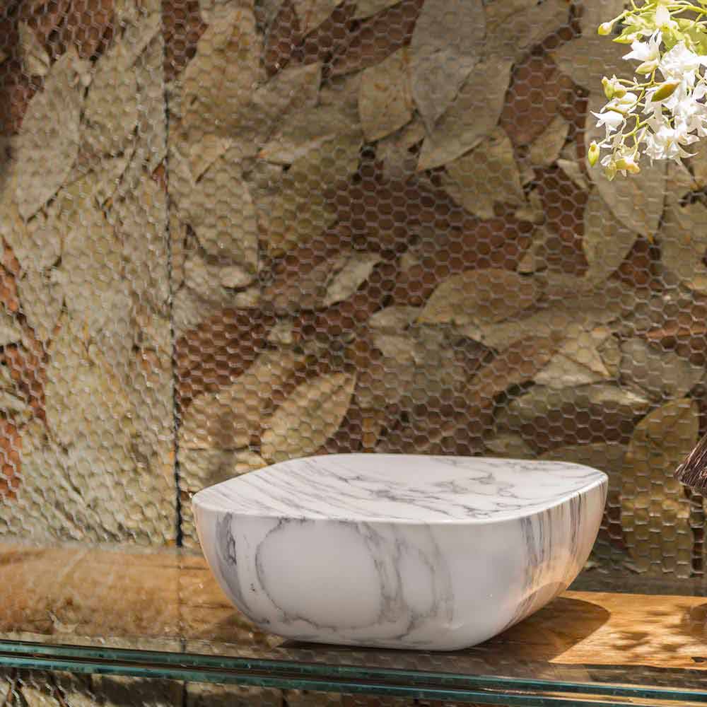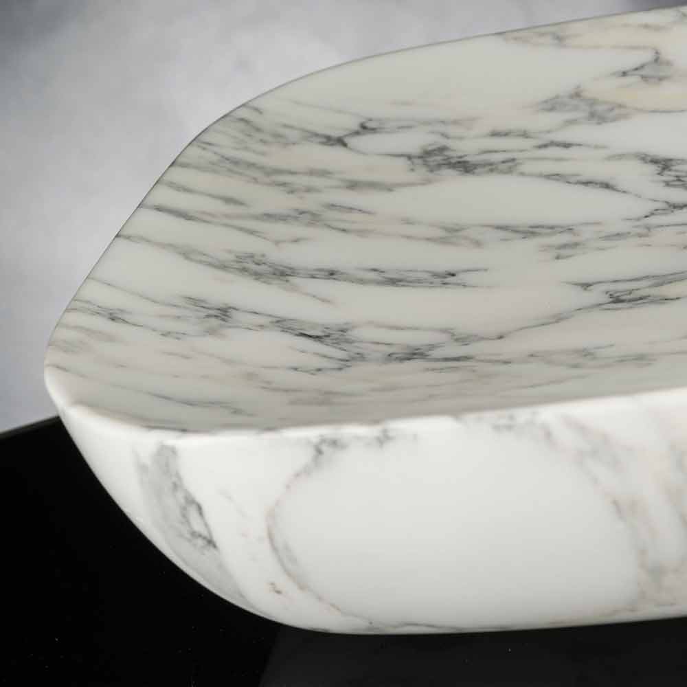 Tavă decorativă fabricată în Italia în marmura albă Carrrara , o varietate prețioasă de marmură care se realizează prin prelucrarea pietrelor naturale permite obținerea unor forme mai complexe. Un obiect de eleganță intrinsecă care apare din întâlnirea dintre studiul fenomenelor naturale și interacțiunea diferitelor materiale cu tehnologiile folosite de om. Rezultatul este o piesă de mobilier sofisticată și versatilă care îi permite să fie folosită ca o adevărată tavă, ca o piesă centrală rafinată, dar și ca un gol de buzunar dacă este poziționat la intrare sau ca un element decorativ simplu în orice loc al casei, dovedind capabil să dea o notă suplimentară mobilierului datorită eleganței atemporale a marmurei și a venelor sale minunate.