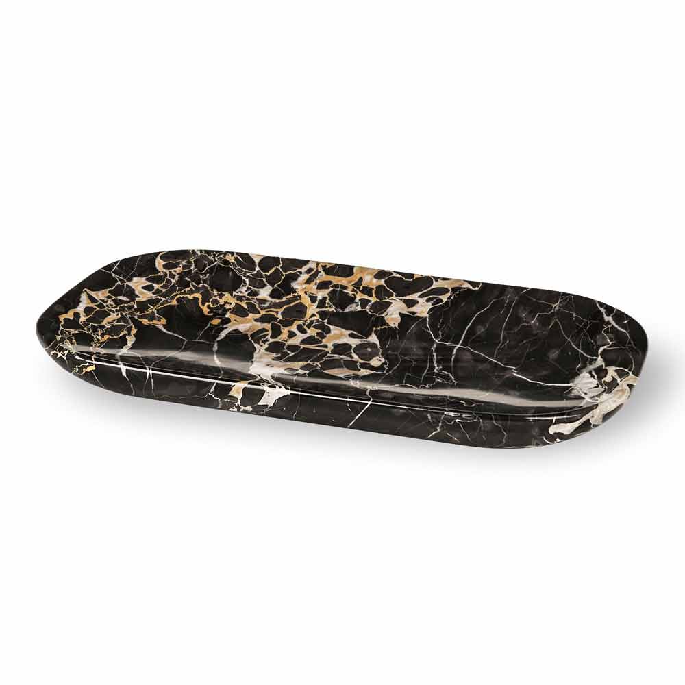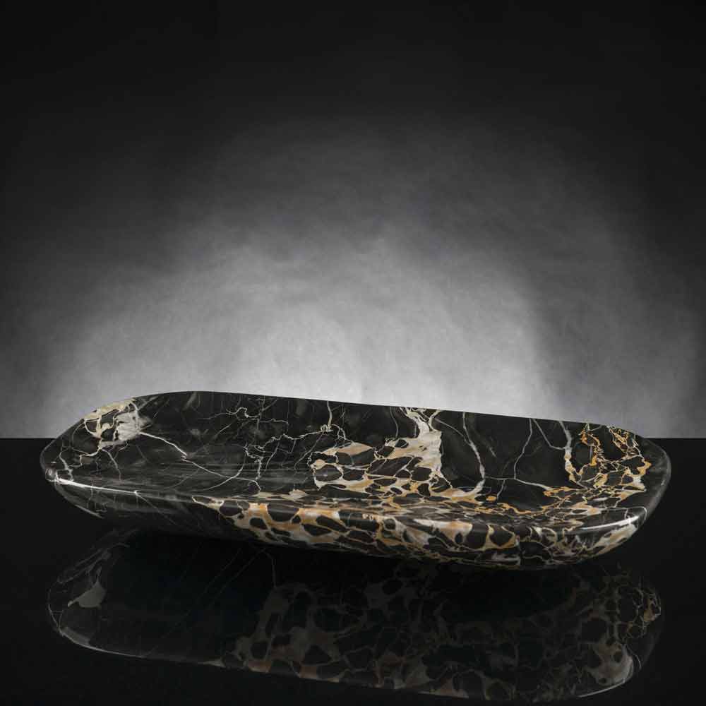 Tava decorativă realizată în întregime în Italia în marmură Portoro , un material care prin prelucrarea pietrelor naturale permite obținerea unor forme mai complexe. Un obiect de eleganță intrinsecă care apare din întâlnirea dintre studiul fenomenelor naturale și interacțiunea diferitelor materiale cu tehnologiile folosite de om. Rezultatul este un accesoriu de mobilier sofisticat capabil să îmbogățească orice masă sau zonă a casei, permițându-i să fie folosit ca o tavă reală, dar și ca un gol de buzunar sau ca un simplu element decorativ capabil să dea un plus de mobilier datorită eleganța atemporală a marmurei și a venelor sale minunate.