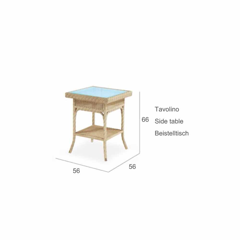 Acest tabel are un top de sticlă mărginită de o legătură într-un model spic, ceea ce îi conferă o notă caracteristică de unicitate și un raft de bază.
