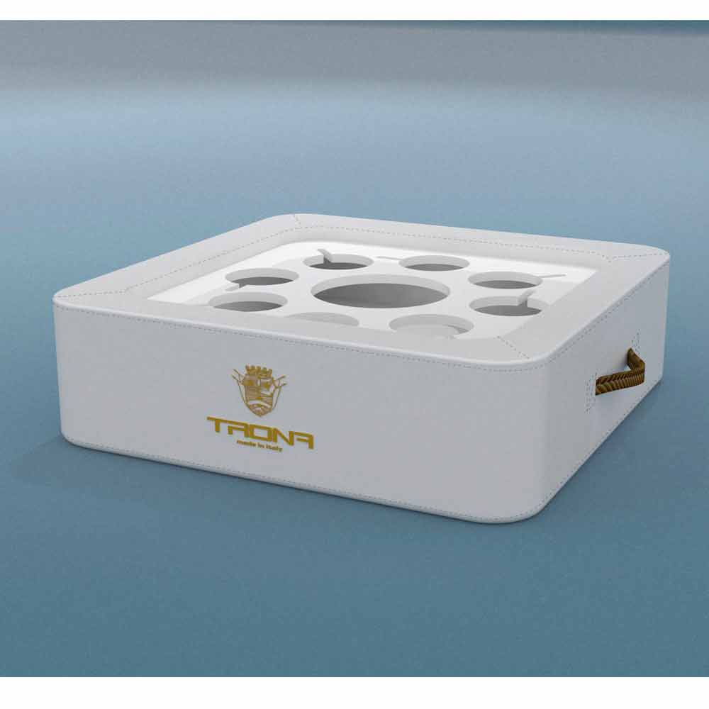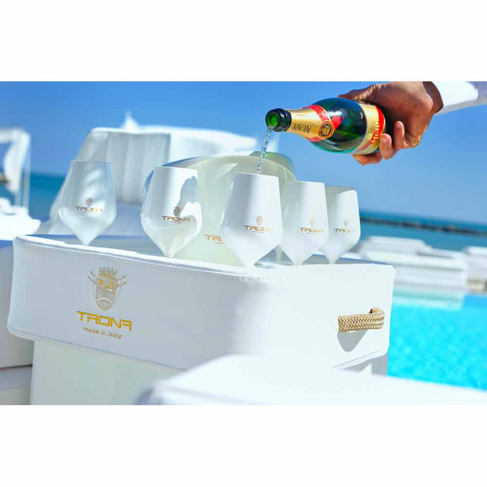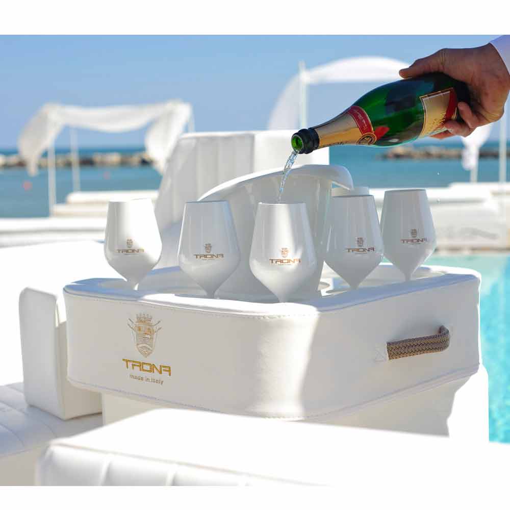 Placa de plexiglas perforată specială, Trona susține sticla, găleată de gheață și pahare în condiții de siguranță, fără riscul de răsturnare. Trona, de fapt, are o gaură centrală ca portaghiaccio / suport pentru sticla si 8 orificii adecvate pentru a aduce pahare de vin sau un cocktail.