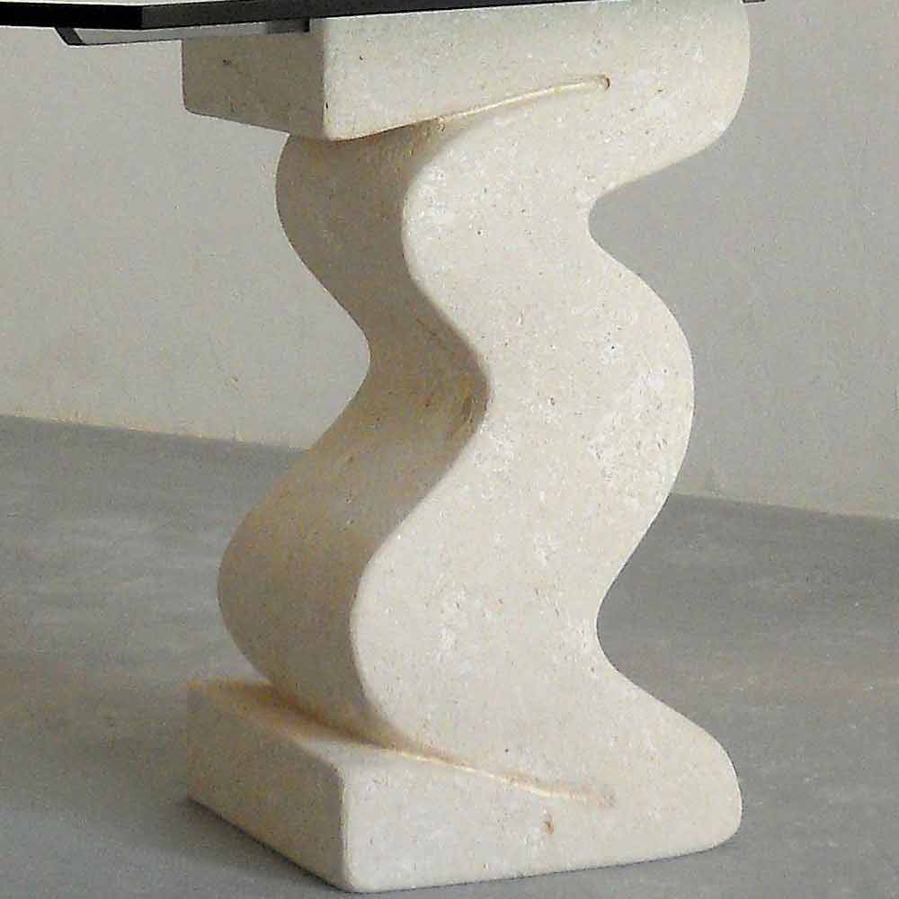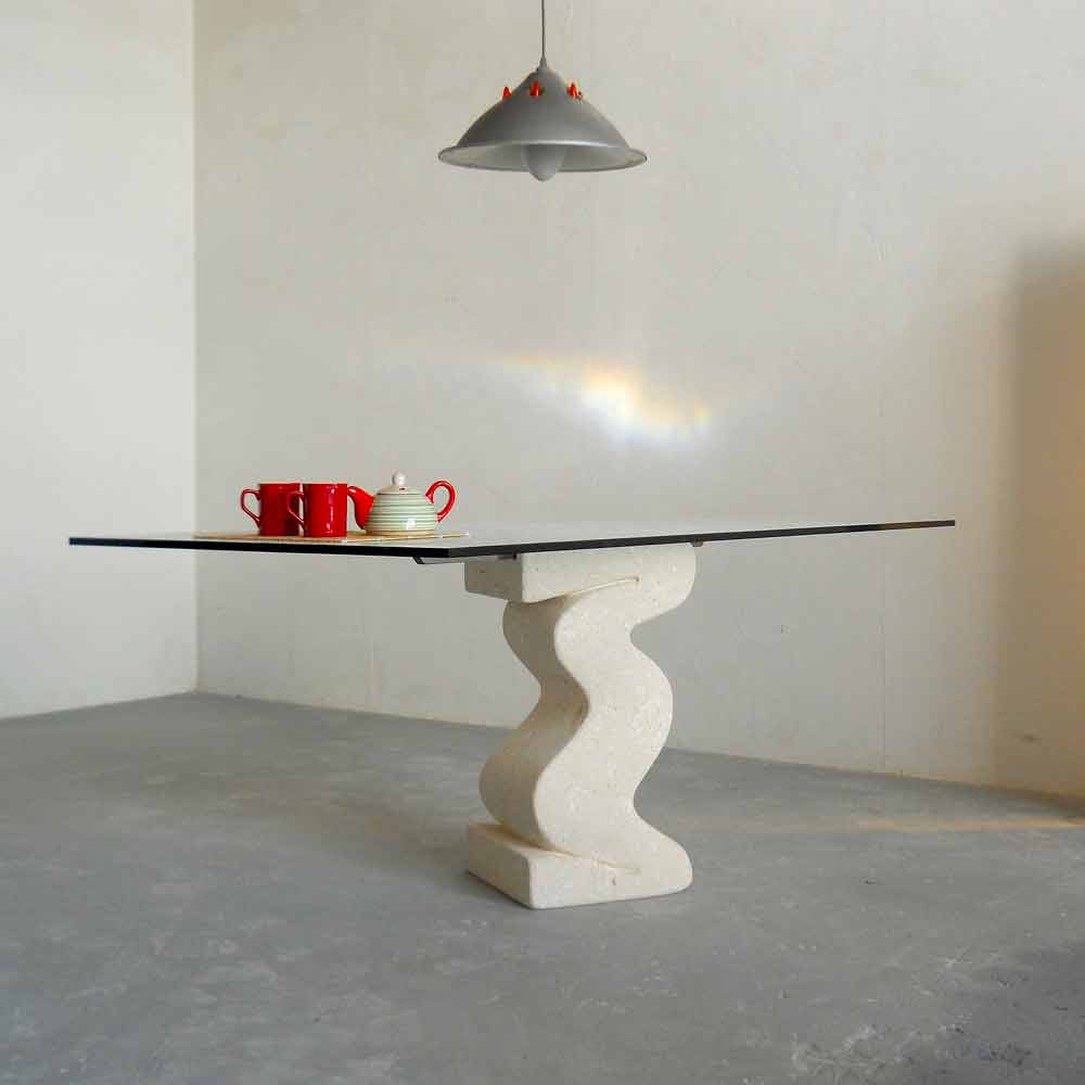 masa dreptunghiulara modernă Made in Italy cu baza centrală din piatră naturală Vicenza, sculptate manual din bloc solid și cu partea de sus float sticla grosime de 15 mm, susținută de o bară de dur periata si metal vopsit.