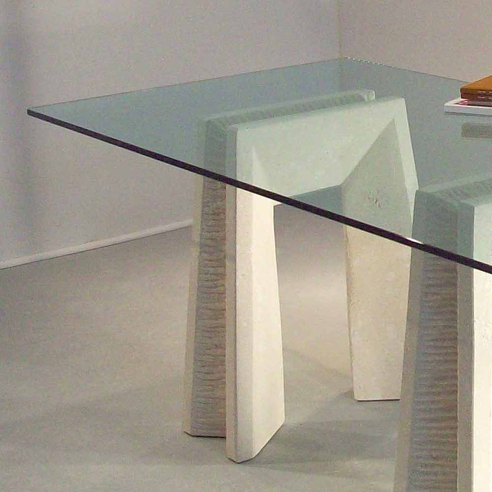 masa dreptunghiulara moderna Made in italia cu bază dublă în piatră naturală din Vicenza, sculptate manual din bloc solid și cu flotor superioară din sticlă cu grosimea de 15 mm, sprijinindu -se pe bazele.