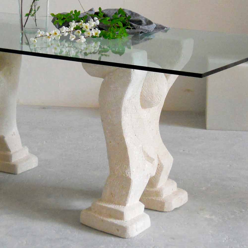 masa dreptunghiulara modernă Made in Italy , cu bază dublă în piatră naturală din Vicenza, sculptate manual din bloc solid și cu flotor superioară din sticlă cu grosimea de 15 mm, sprijinindu -se pe bazele.