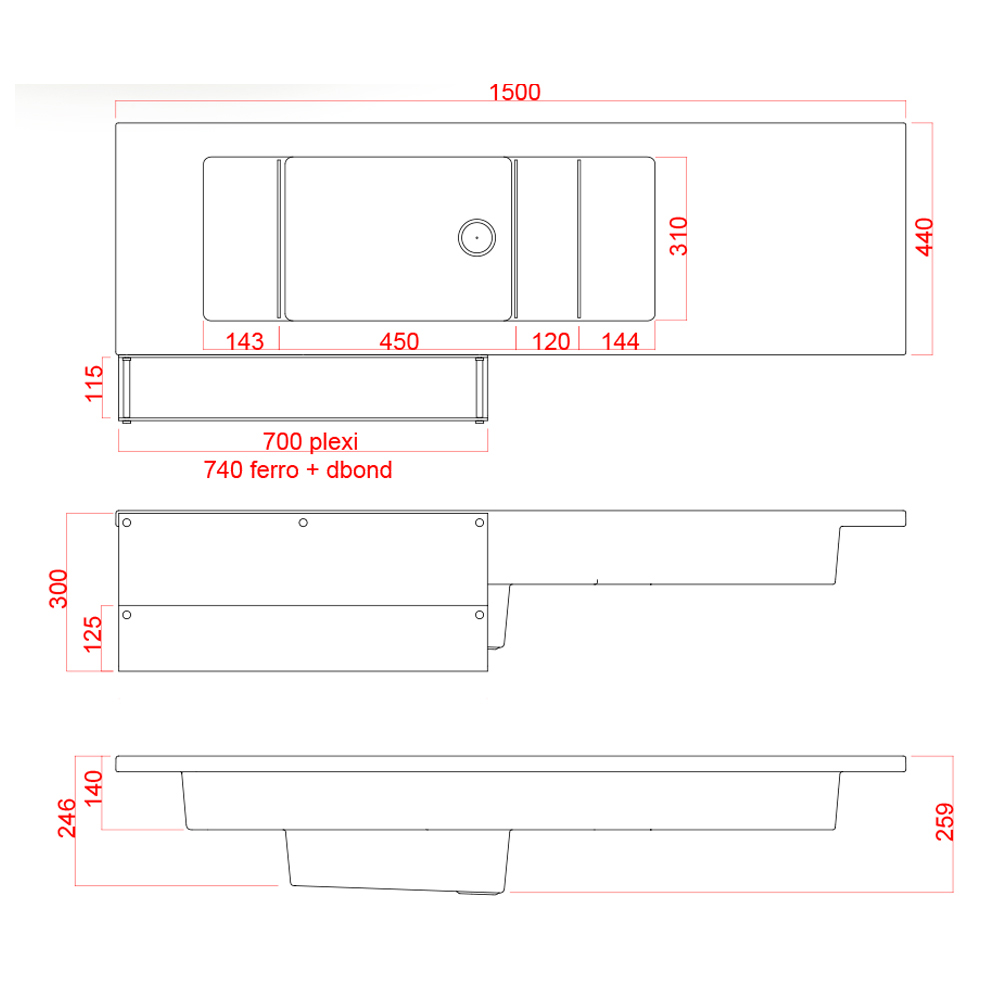 plexiglas. Cura de slabire:- tejghea frontală cu LED alb liniar