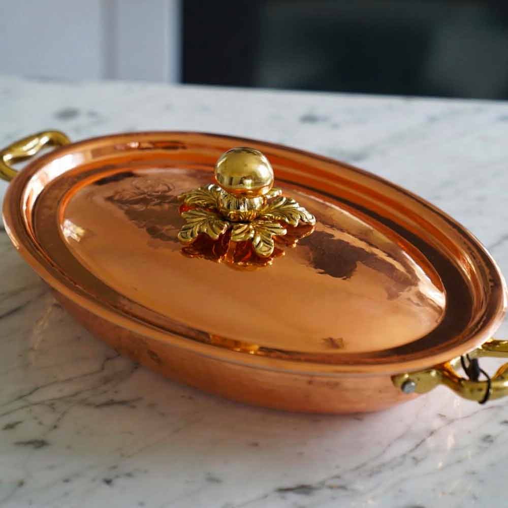Cratita ovala cu capac, lucrat din cupru cositorit manual cu manere din alama fabricate in Italia.