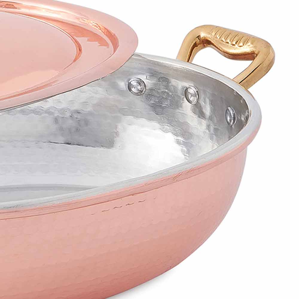 Cratiță ovală cu capac, realizată manual din cupru cu mânere din alamă fabricate în Italia.