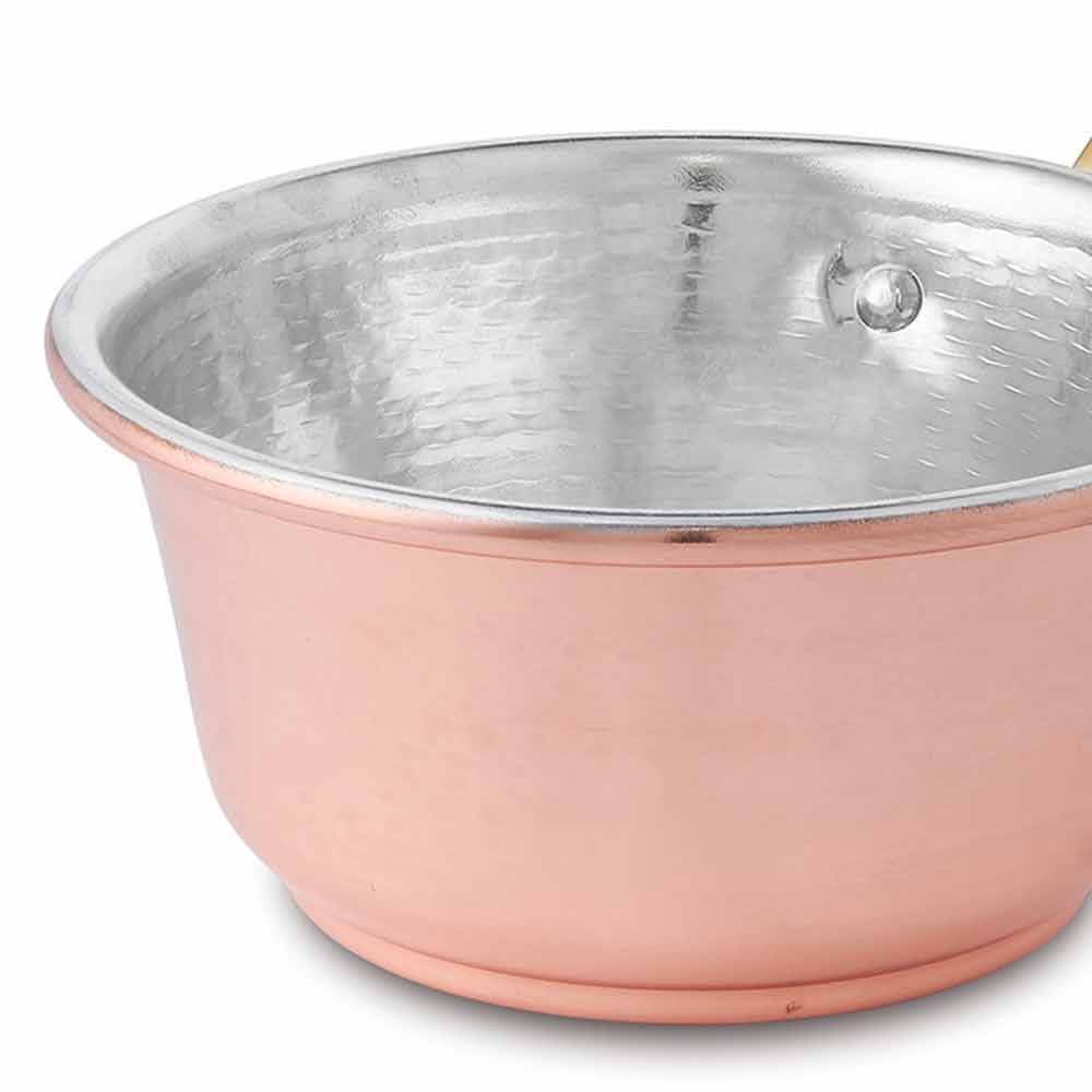 Tigaia practică și funcțională din cupru solid ciocănit și cositorit cu mâner din alamă, exprimă măiestria absolută a măiestriei conform