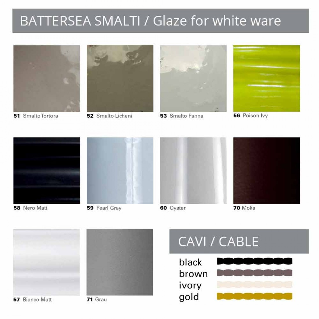 Pe langa posibilitatea de a alege finisajul exterior al ceramicii, este deci posibil sa alegeti si finisajul cablului electric. Exprima-ti creativitatea alegand finisajele pe care le preferi!