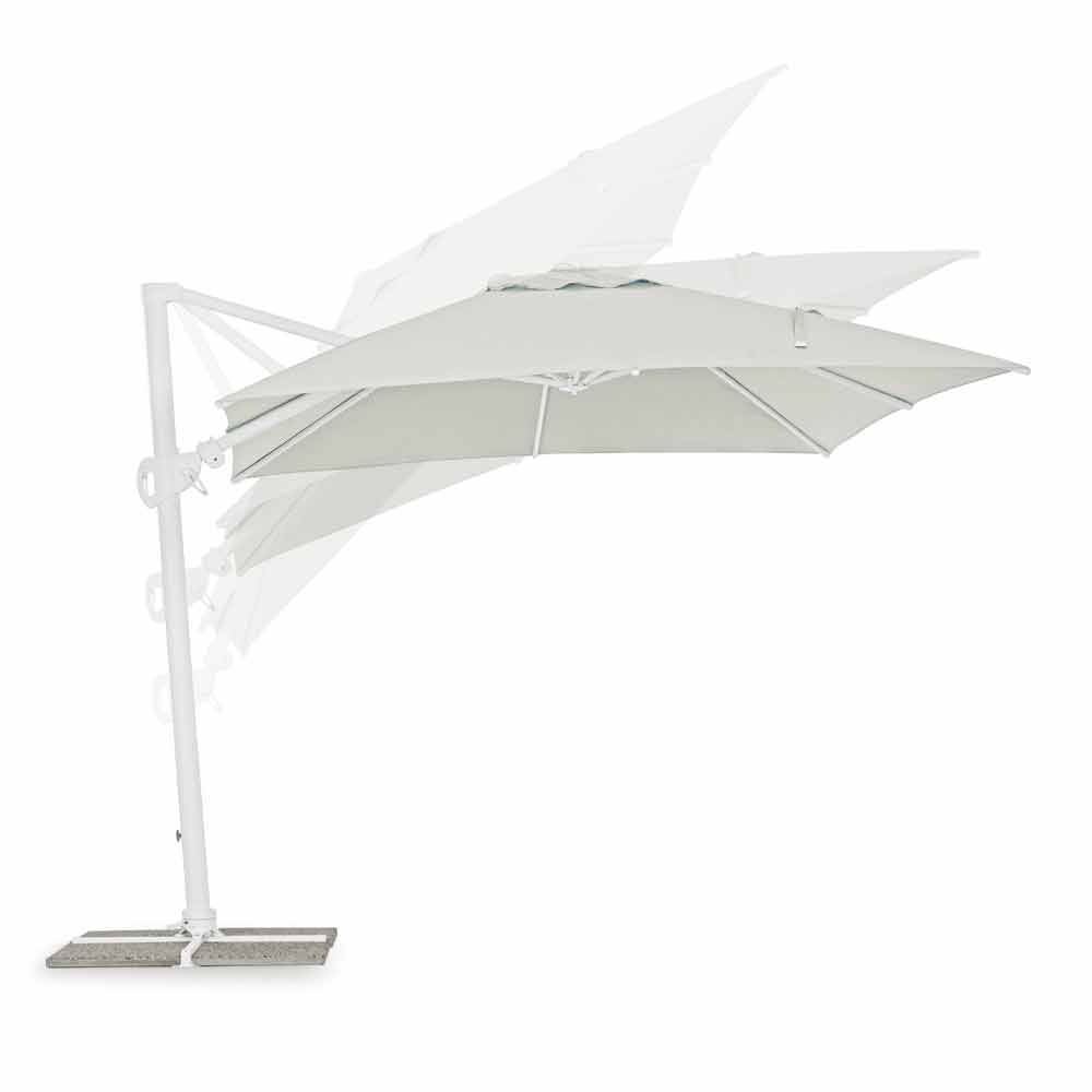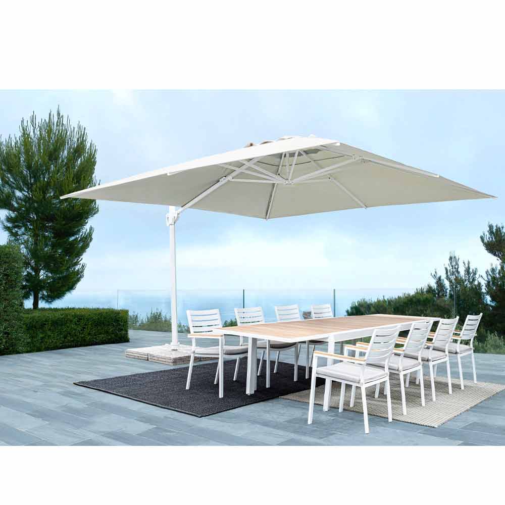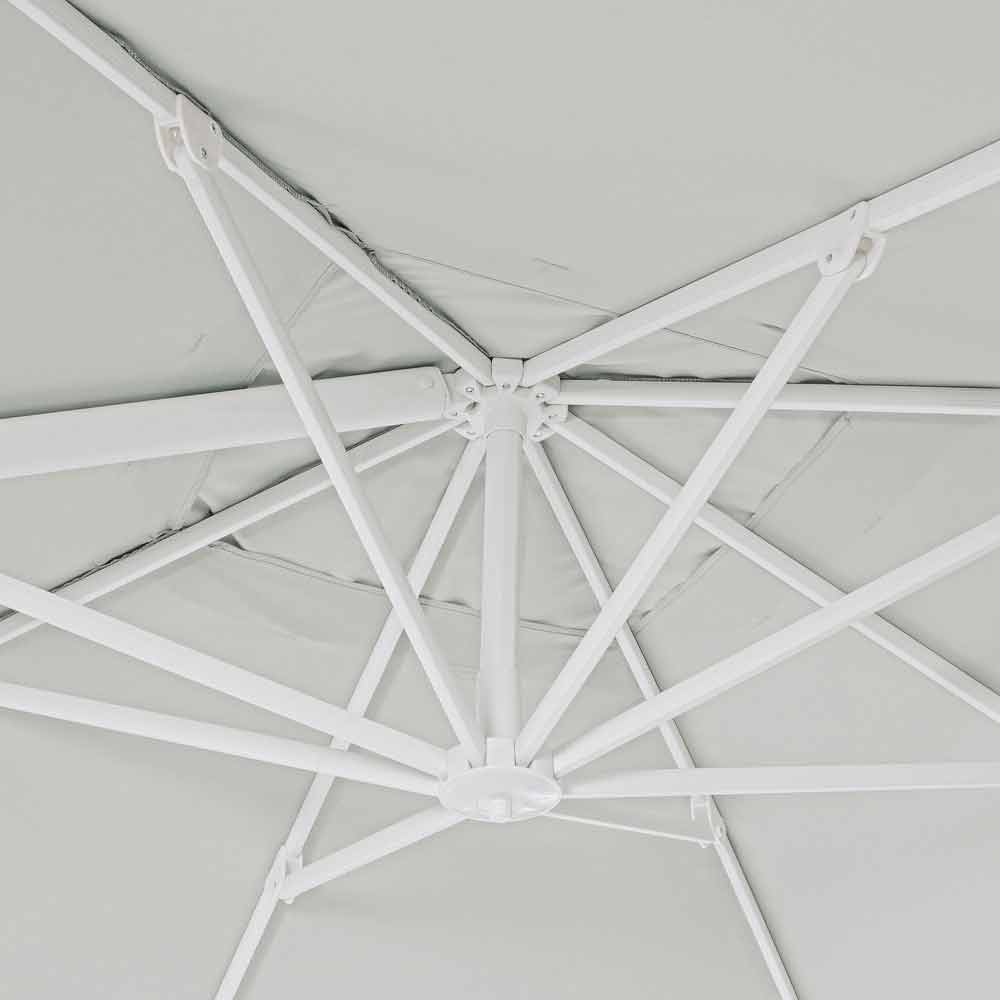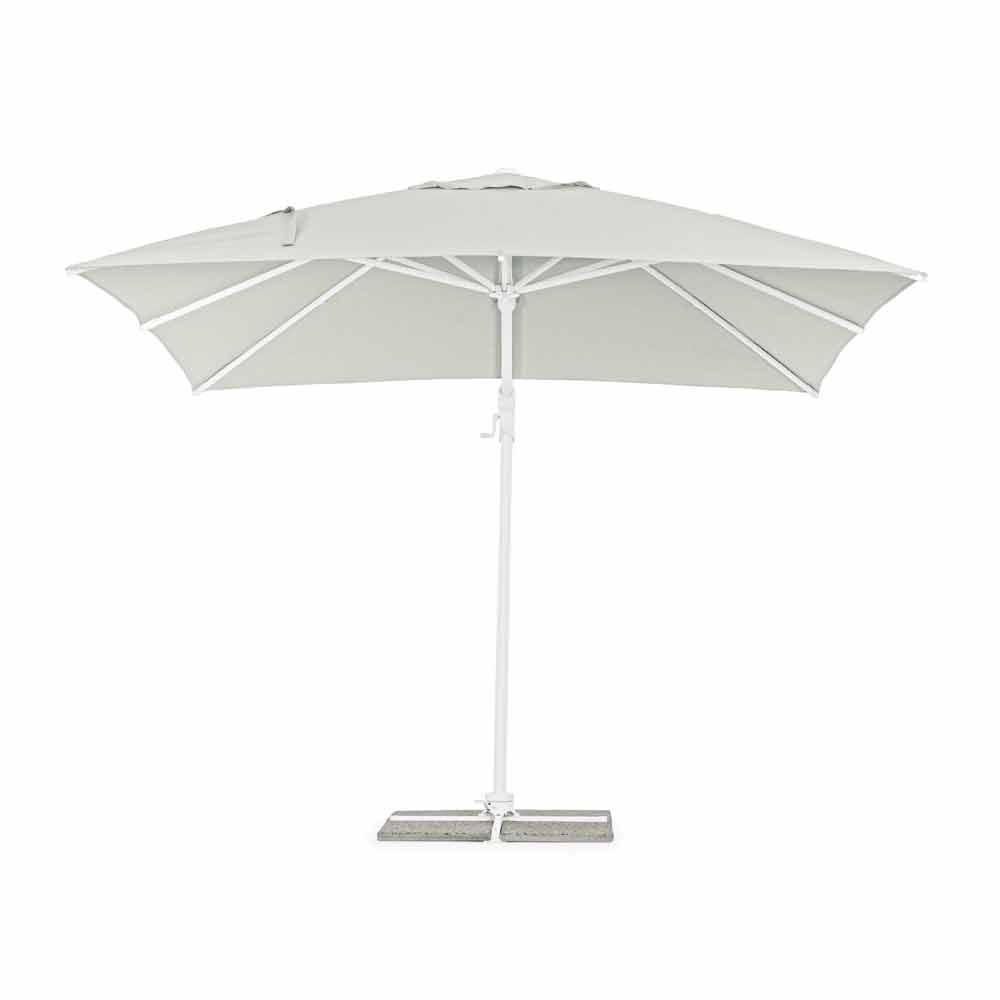 Structură din aluminiu acoperit cu pulbere (poliester). Stâlp de 90x60mm, 8 nervuri de 25x17mm, țesătură din poliester natural de 250gr / m2 cu acoperire pa (poliamidă), bază transversală din oțel, stâlp rotativ 360 ° cu pedală. Înclinare verticală cu mâner în 6 poziții, echipat cu un sistem de înclinare dreapta-stânga pentru umbrelă.