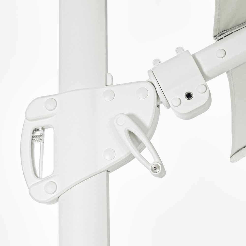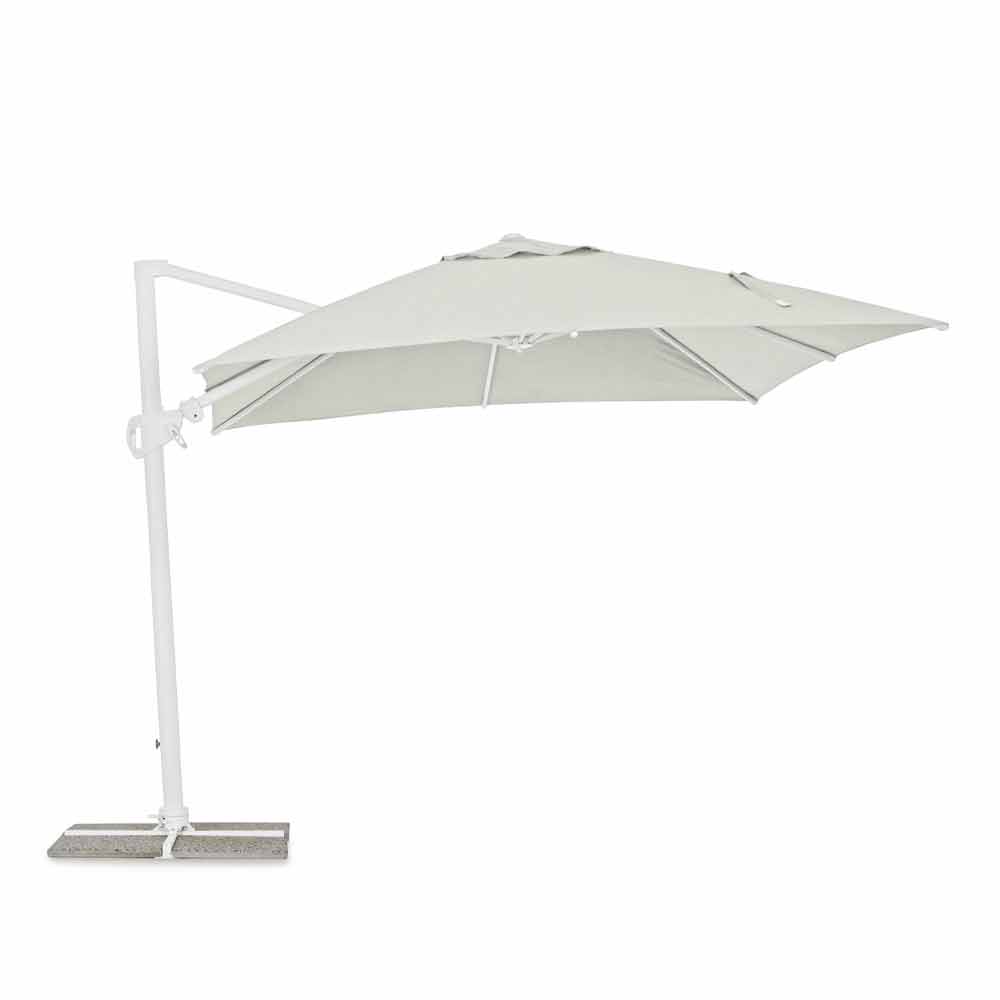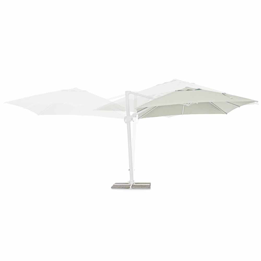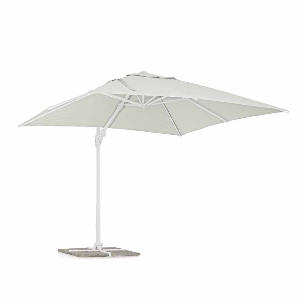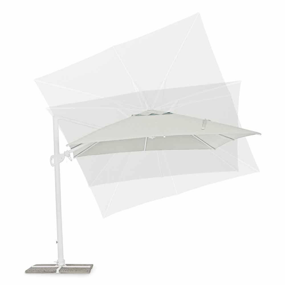 Structură din aluminiu acoperit cu pulbere (poliester). Stâlp de 90x60mm, 8 nervuri de 25x17mm, țesătură din poliester natural de 250gr / m2 cu acoperire pa (poliamidă), bază transversală din oțel, stâlp rotativ 360 ° cu pedală. Înclinare verticală cu mâner în 6 poziții, echipat cu un sistem de înclinare dreapta-stânga pentru umbrelă.