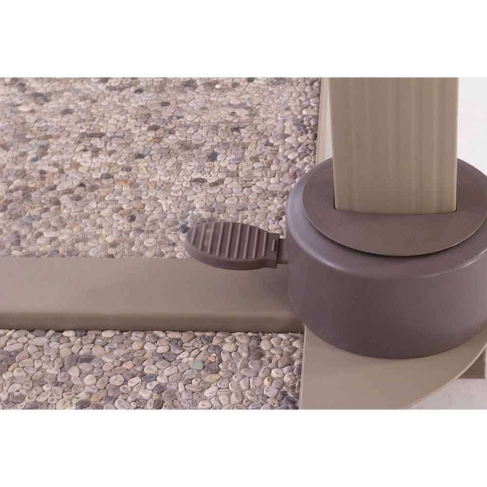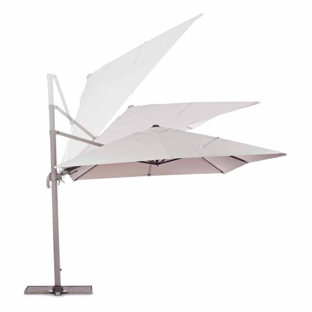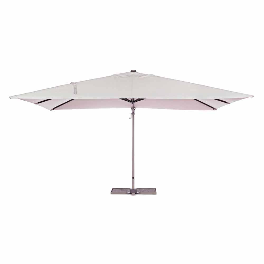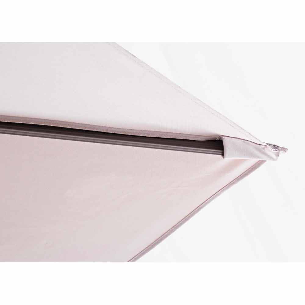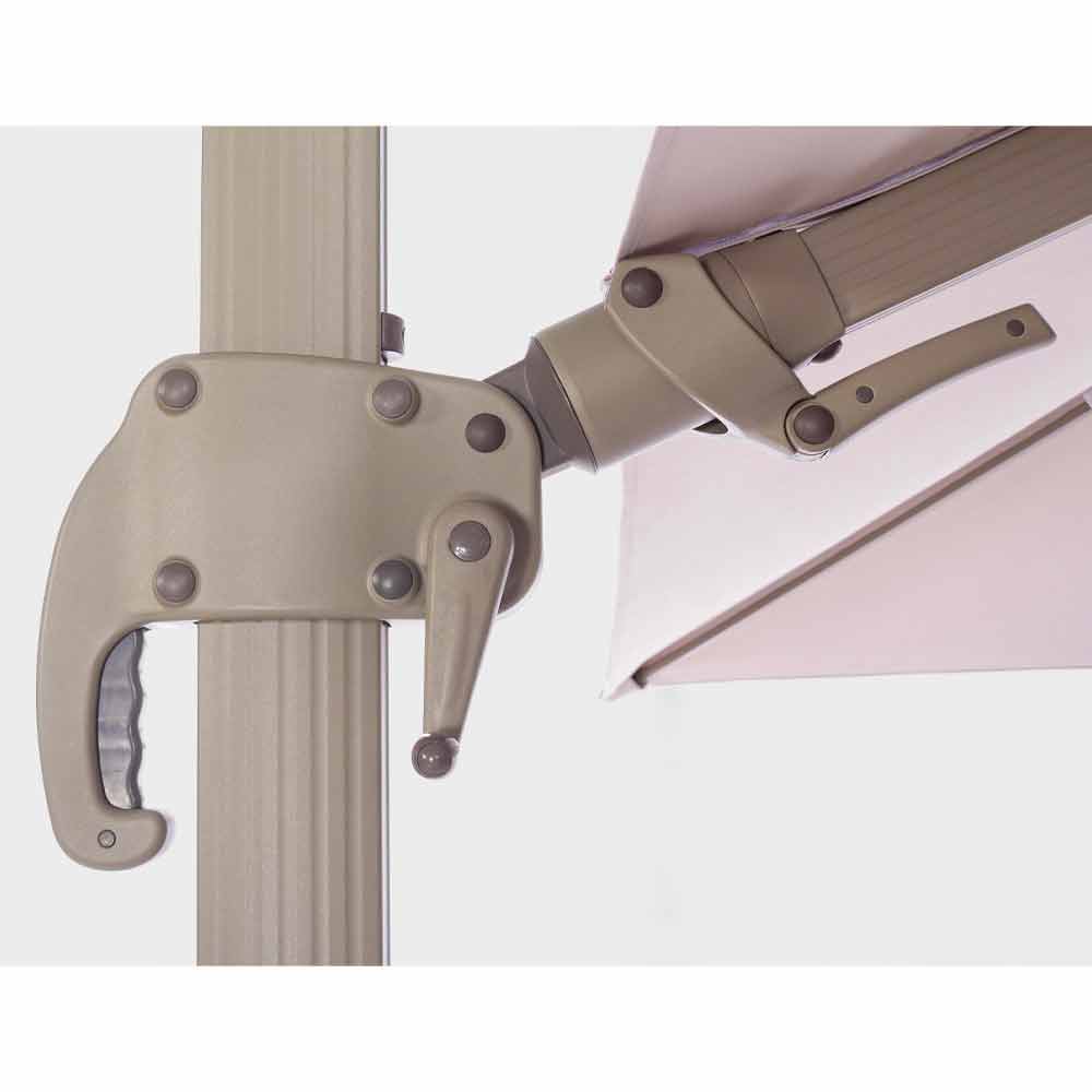 Structură din aluminiu acoperit cu pulbere (poliester). Stâlp 57x93x2mm, 8 nervuri 25x17x1mm. Husă din poliester de culoare nisip 250gr / m2 cu acoperire pa (poliamidă). Baza laterală din oțel . Pol rotativ manual la 360 °. Înclinare verticală cu mâner în 5 poziții. Echipat cu mâner pentru înclinarea dreapta-stânga a umbrelei.