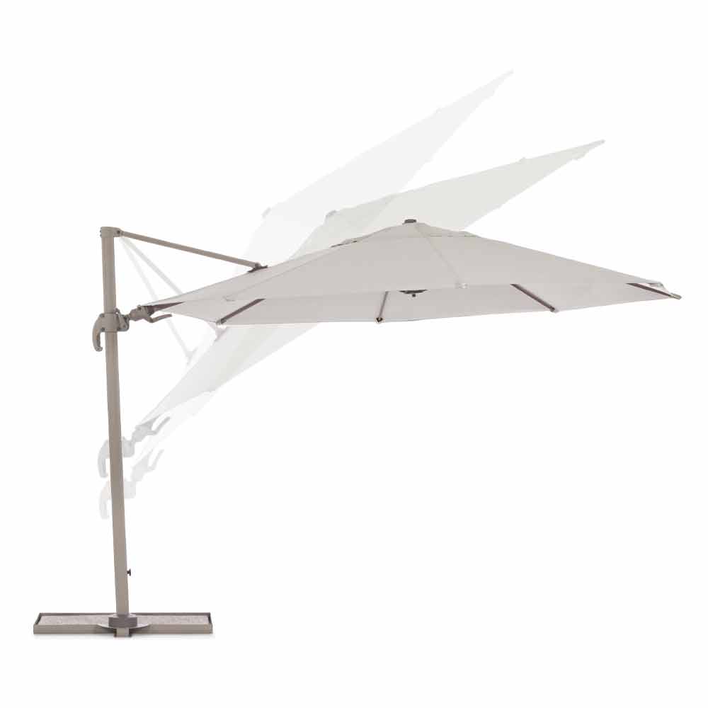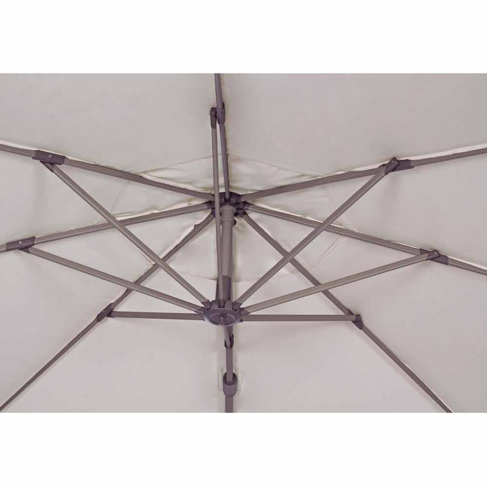 Structură din aluminiu acoperit cu pulbere (poliester). Stâlp 50x78x1,6mm. 8 nervuri 12x23x1.0mm. Țesătură poliesterică de culoare nisip 200gr / m2 cu acoperire pa (poliamidă). Baza laterală din oțel . Stâlp rotativ 360 ° cu pedală. Înclinare verticală cu mâner în 5 poziții. Echipat cu mâner pentru înclinarea dreapta-stânga a umbrelei.