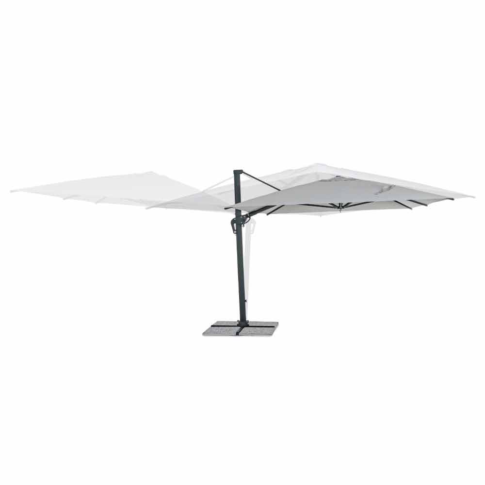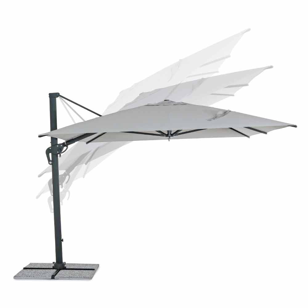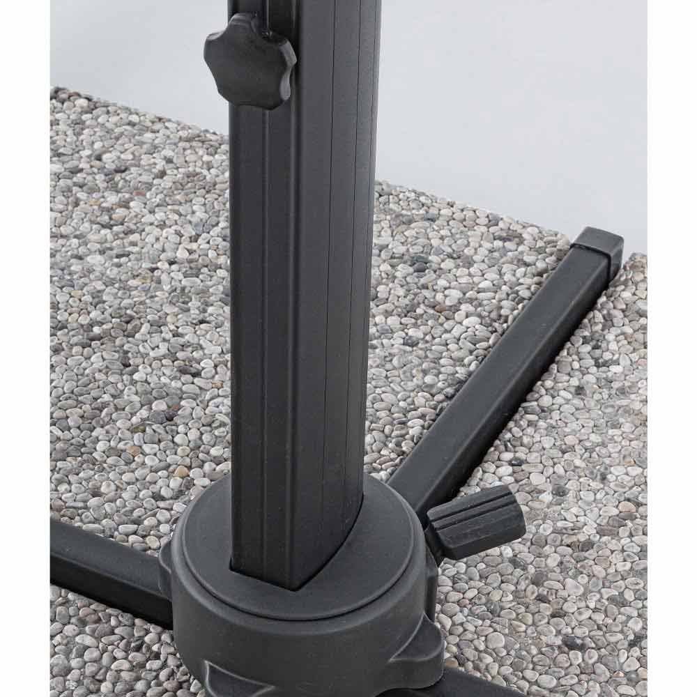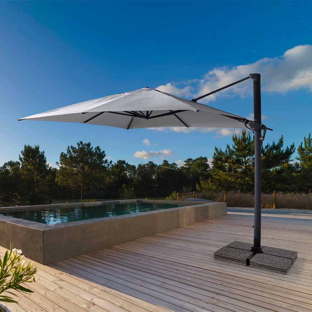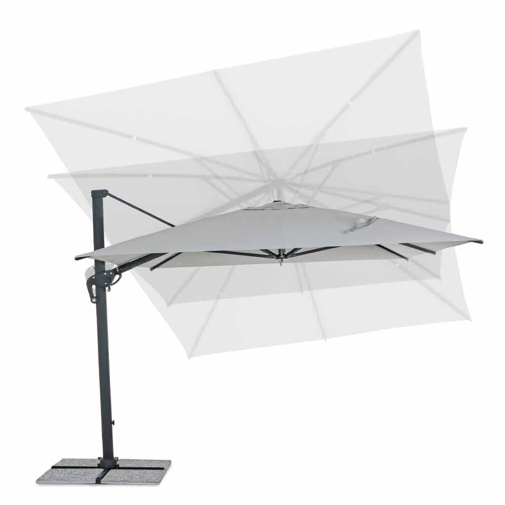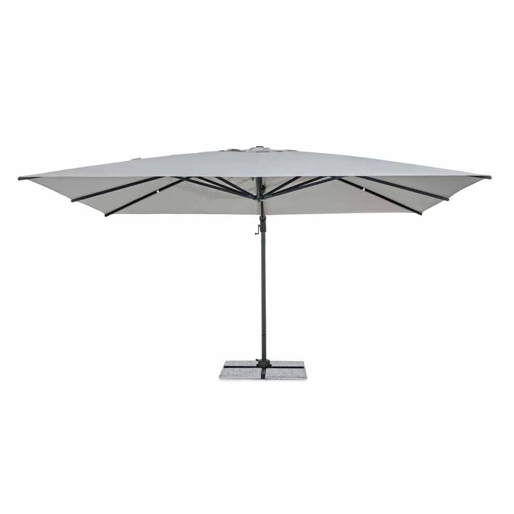 Structură din aluminiu acoperit cu pulbere (poliester). Stâlp de 93x57mm. 8 coaste 28x18mm. Țesătură de poliester gri deschis 250gr / m2 cu acoperire pa (poliamidă). Baza transversală din oțel . Stâlp rotativ 360 ° cu pedală. Înclinare verticală cu mâner în 5 poziții. Echipat cu mâner pentru înclinarea dreapta-stânga a umbrelei.