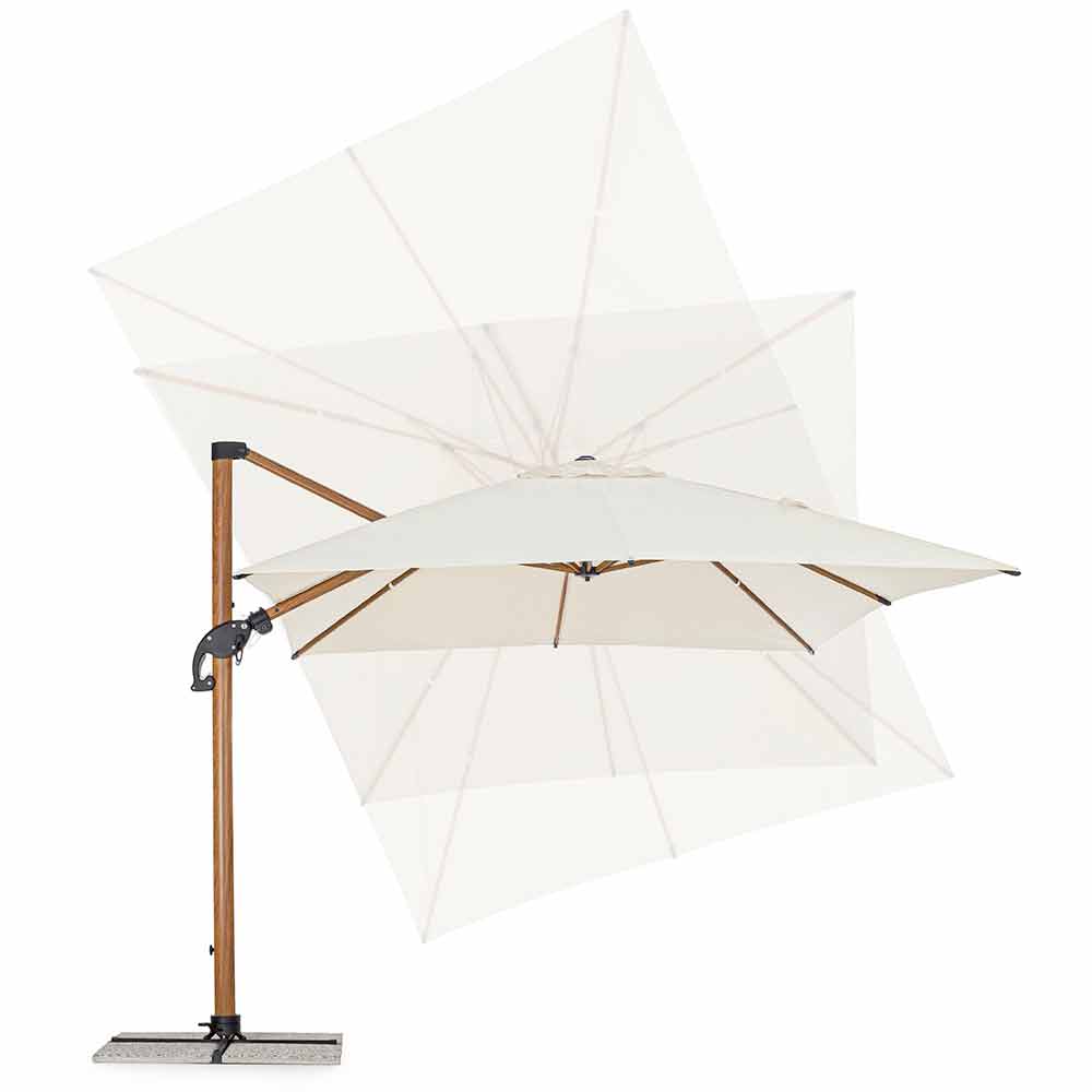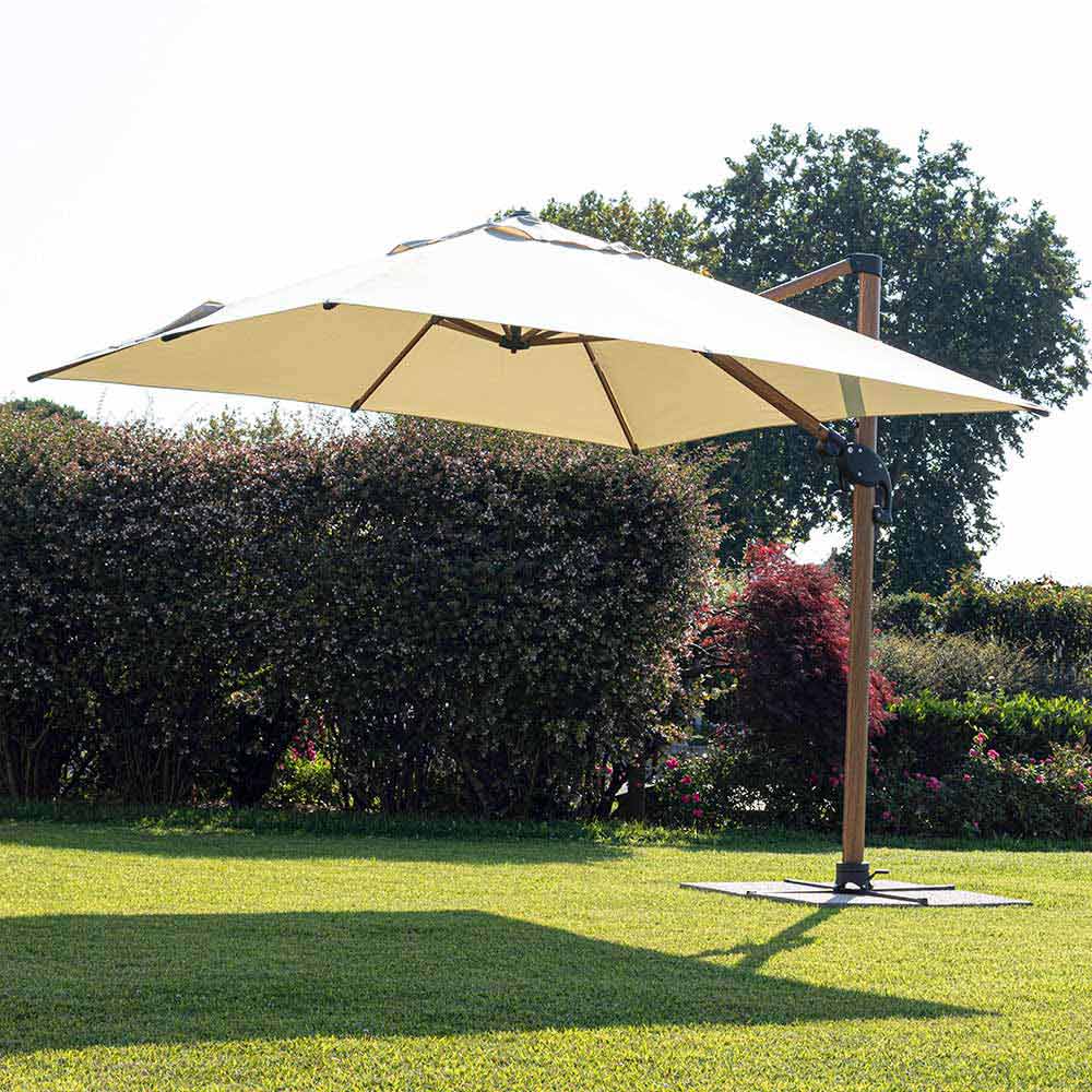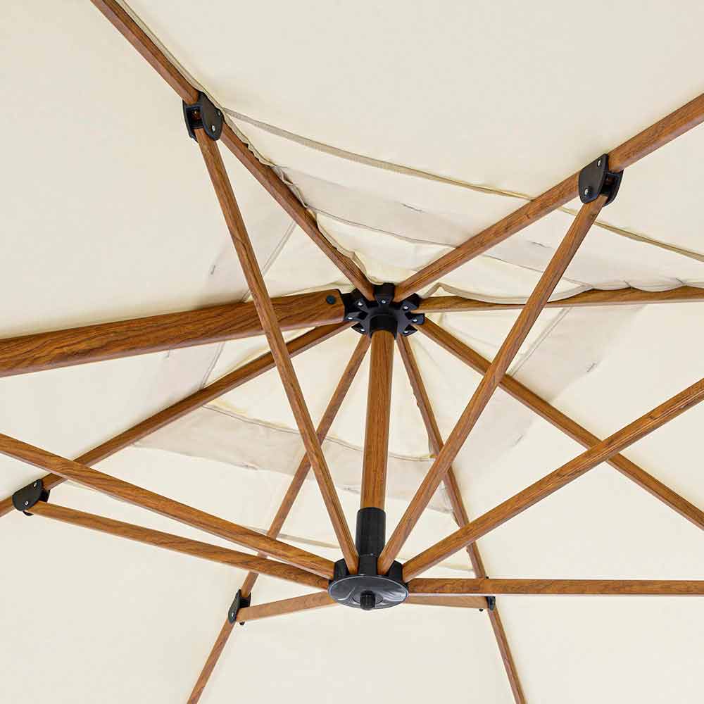 Structură din aluminiu , acoperită cu pulbere (poliester) cu efect de lemn. Stâlp de 90x60mm, 8 nervuri 25x17 mm. Țesătură de poliester bej 250 gr / m2 cu acoperire PA (poliamidă). Baza transversală din oțel . Stâlp rotativ 360 ° cu pedală. Înclinare verticală cu mâner în 5 poziții. Echipat cu sistem de înclinare a umbrelei dreapta-stânga. Inclusiv capacul umbrelei .
