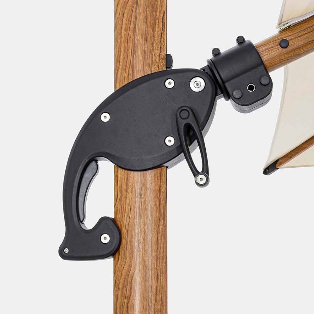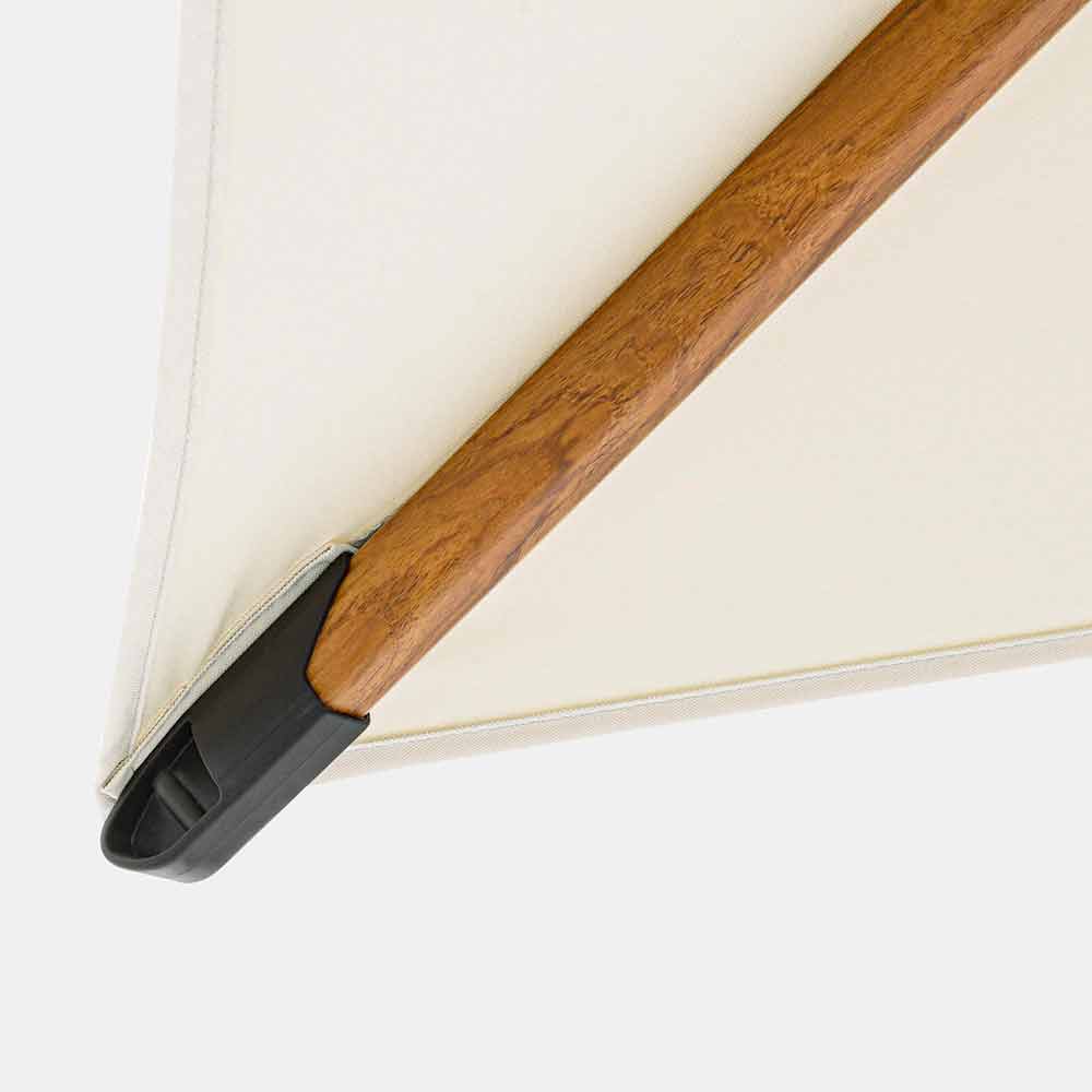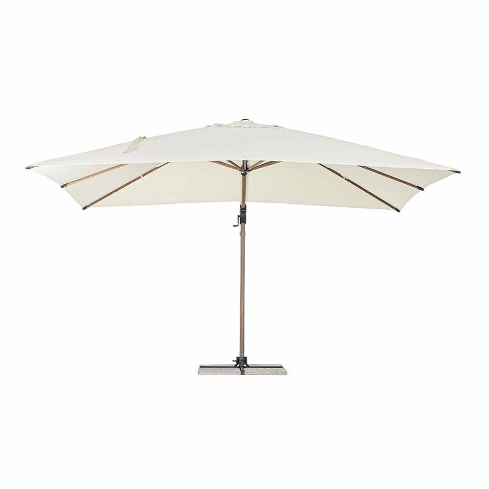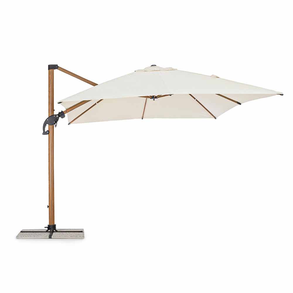 Structură din aluminiu , acoperită cu pulbere (poliester) cu efect de lemn. Stâlp de 90x60mm, 8 nervuri 25x17 mm. Țesătură de poliester bej 250 gr / m2 cu acoperire PA (poliamidă). Baza transversală din oțel . Stâlp rotativ 360 ° cu pedală. Înclinare verticală cu mâner în 5 poziții. Echipat cu sistem de înclinare a umbrelei dreapta-stânga. Inclusiv capacul umbrelei .