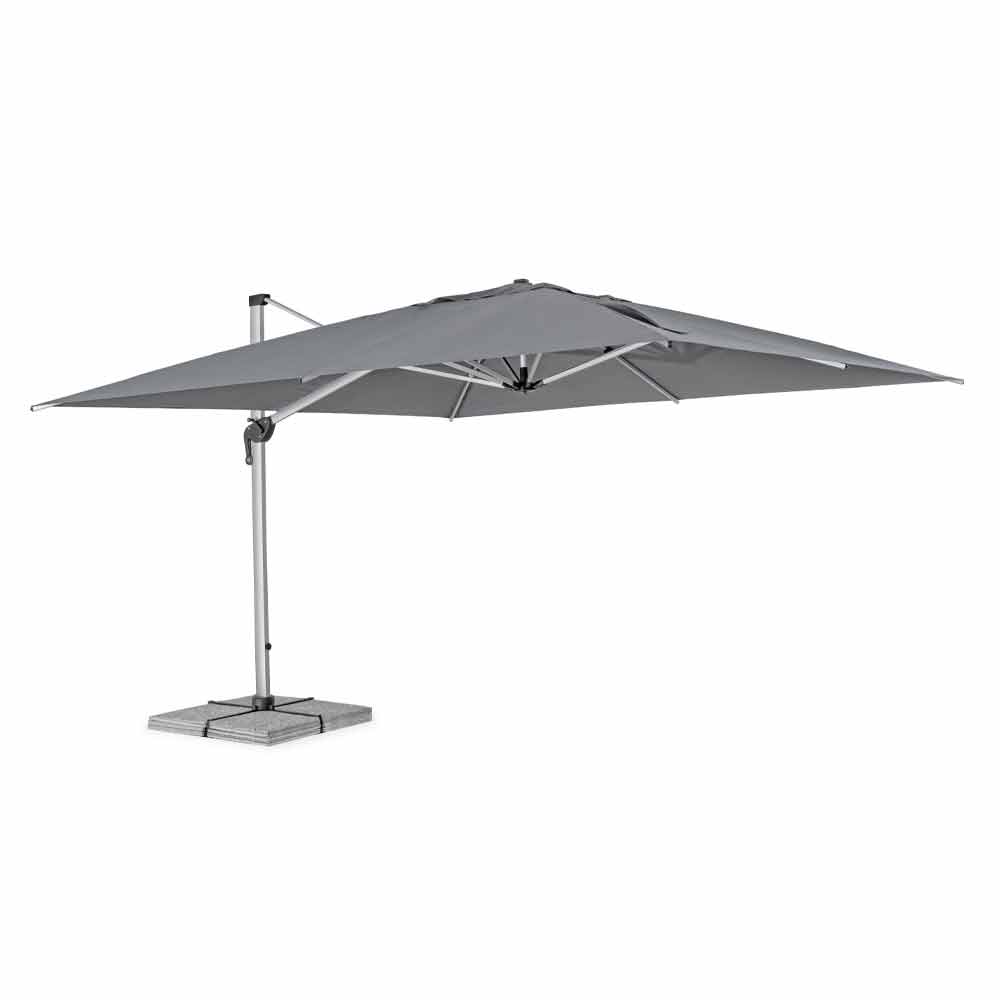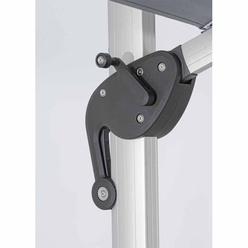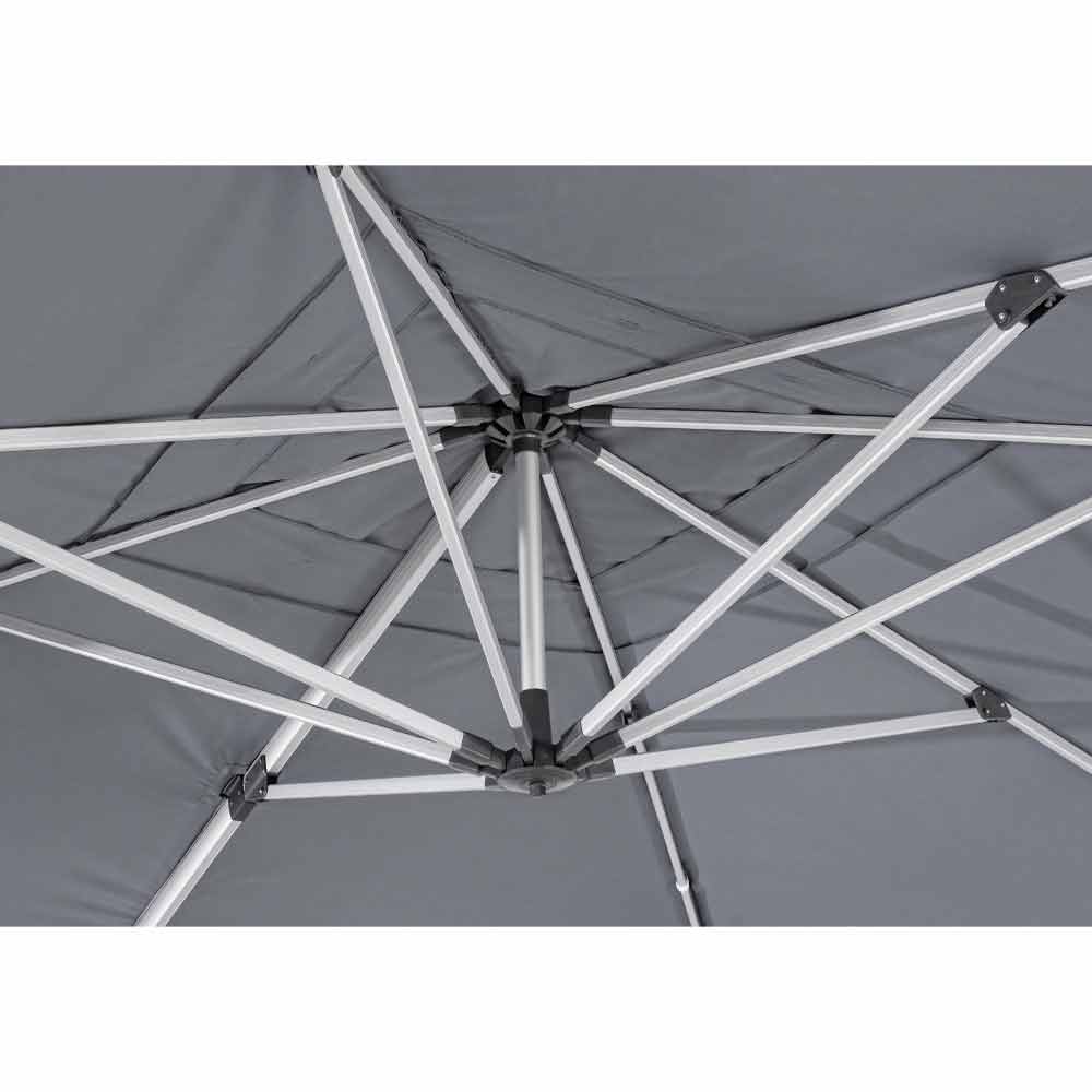 Structură din aluminiu anodizat . Stâlp de 93x57mm. 8 coaste 28x18mm. Foaie de poliester gri închis 250gr / m2 cu acoperire pa (poliamidă). Baza transversală din oțel . Stâlp rotativ 360 ° cu pedală. Înclinare verticală cu mâner în 5 poziții. Inclusiv capacul umbrelei.