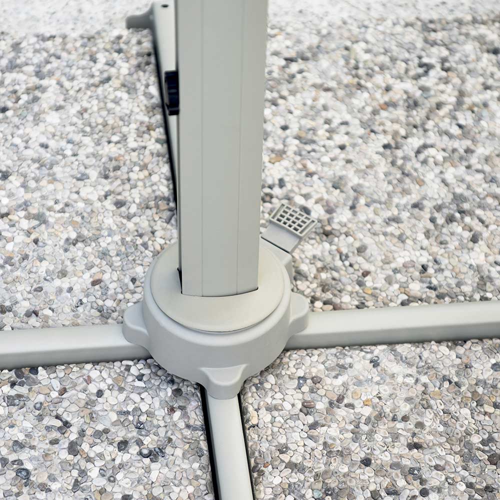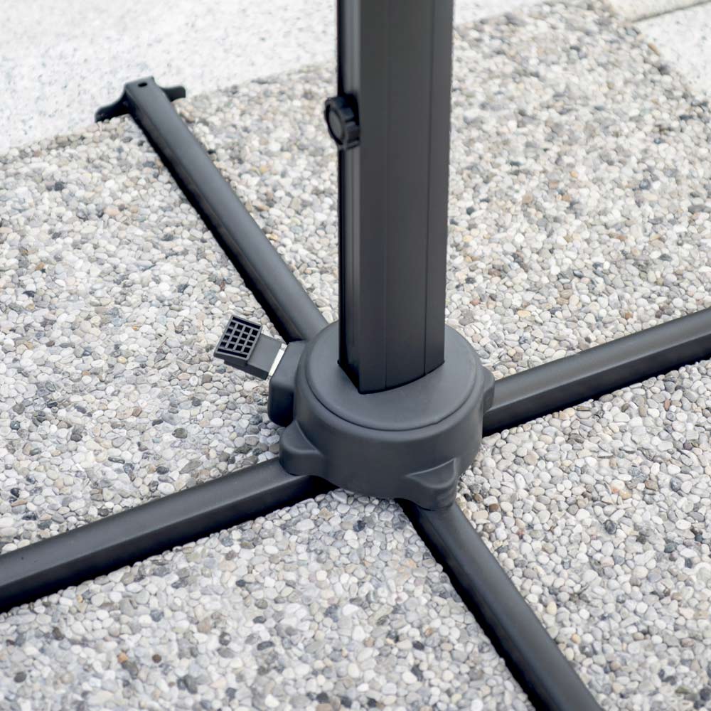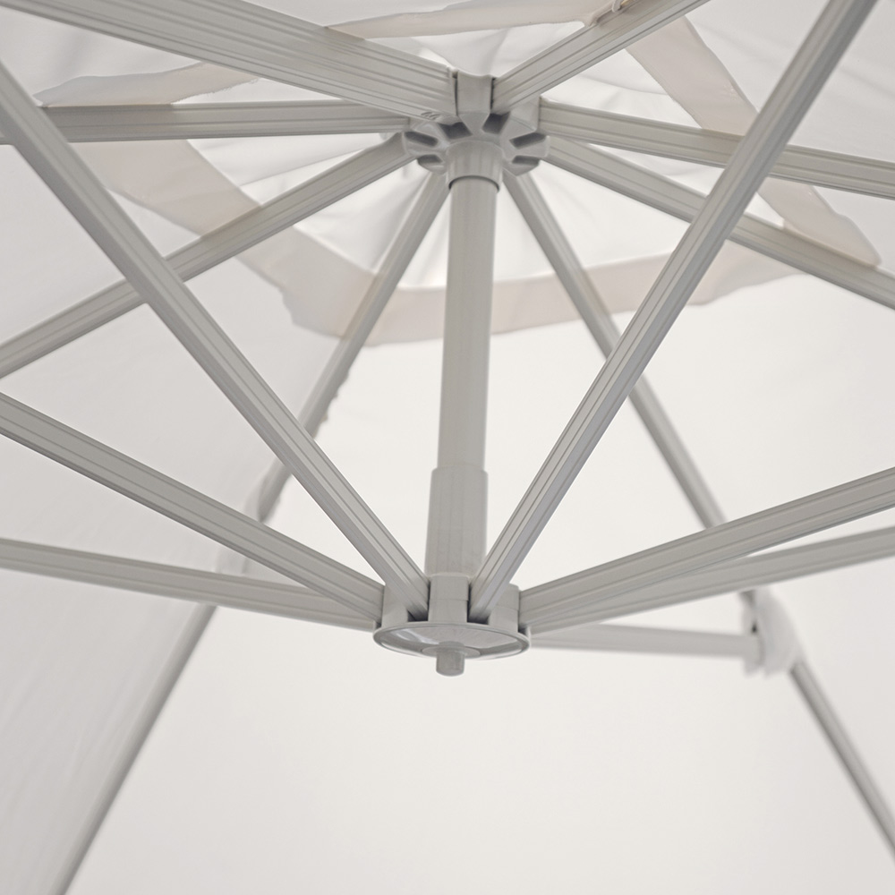 Această umbrelă laterală combină designul modern, caracterul practic și durabilitatea , oferind o acoperire elegantă pentru orice spațiu exterior. Rama din aluminiu , cu un stâlp de 77 x 53 mm și opt nervuri de 14 x 24 mm , asigură stabilitate și robustețe, menținând în același timp o estetică curată și contemporană.