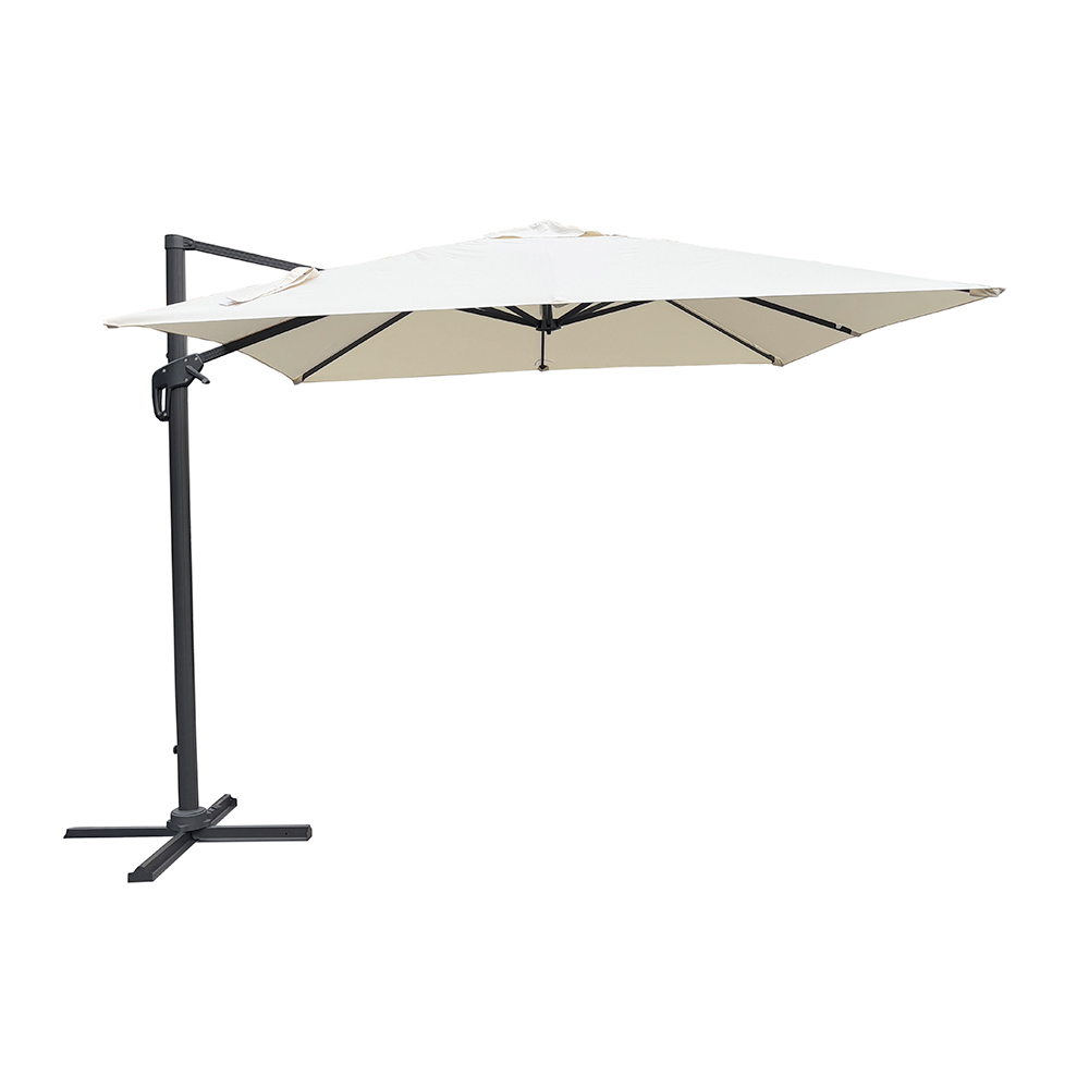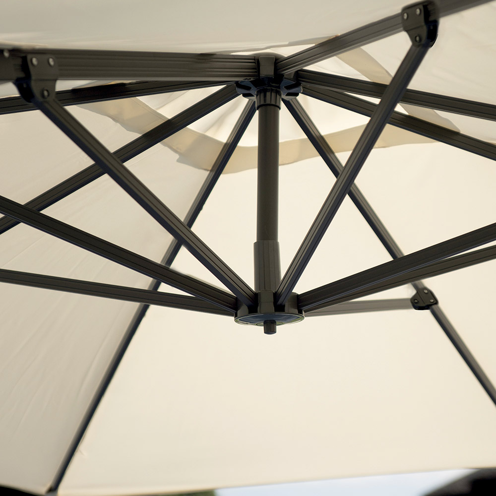 Copertina din poliester ecru de 250 g oferă o protecție excelentă împotriva razelor solare și este foarte rezistentă la intemperii, creând o zonă umbrită spațioasă și primitoare. Datorită sistemului său de rotație la 360° , umbrela poate fi ușor ajustată pentru a se potrivi poziției soarelui, oferind întotdeauna acoperire și confort maxim.