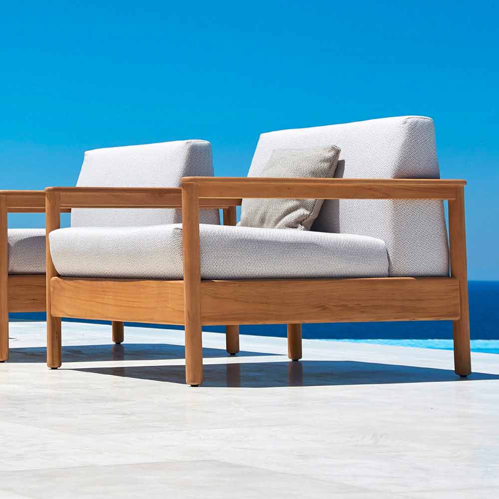 Bali este un fotoliu de grădină fantastic, caracterizat printr-o structură de susținere vizibilă în plantarea solidă de teak solidă și scaunele și spatele acoperite cu material textil și căptușit cu cauciuc Dryfeel.