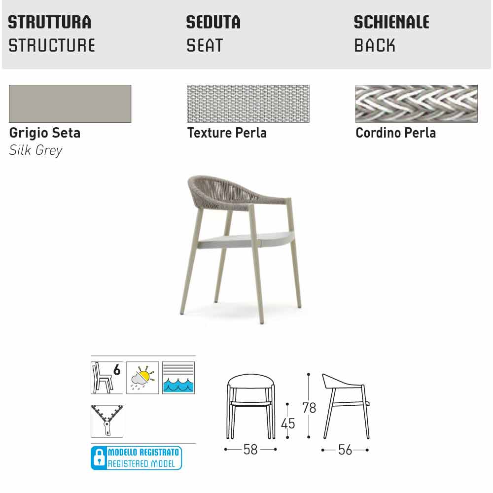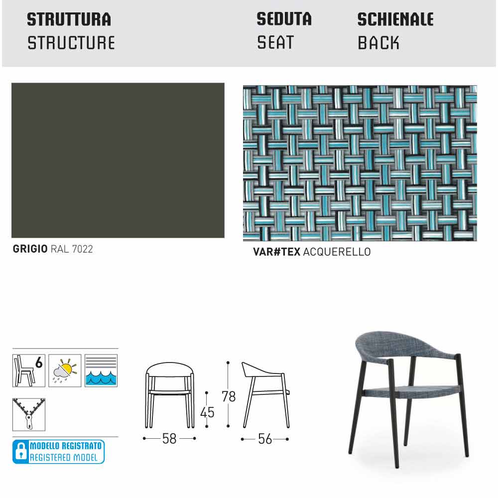 Colectia cu rama din aluminiu, scaun și înapoi în textura perforate în culori diferite sau în VAR # TEX. De asemenea, versiunea disponibilă cu spatele în lonja.