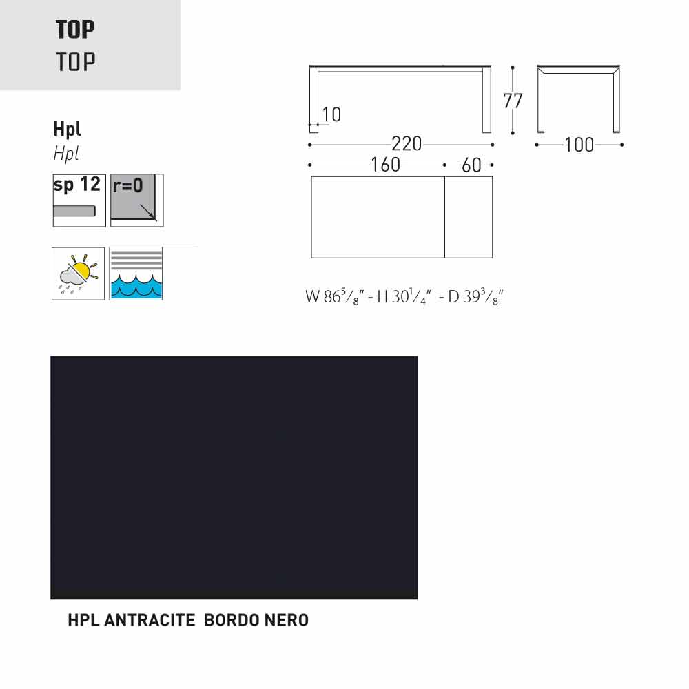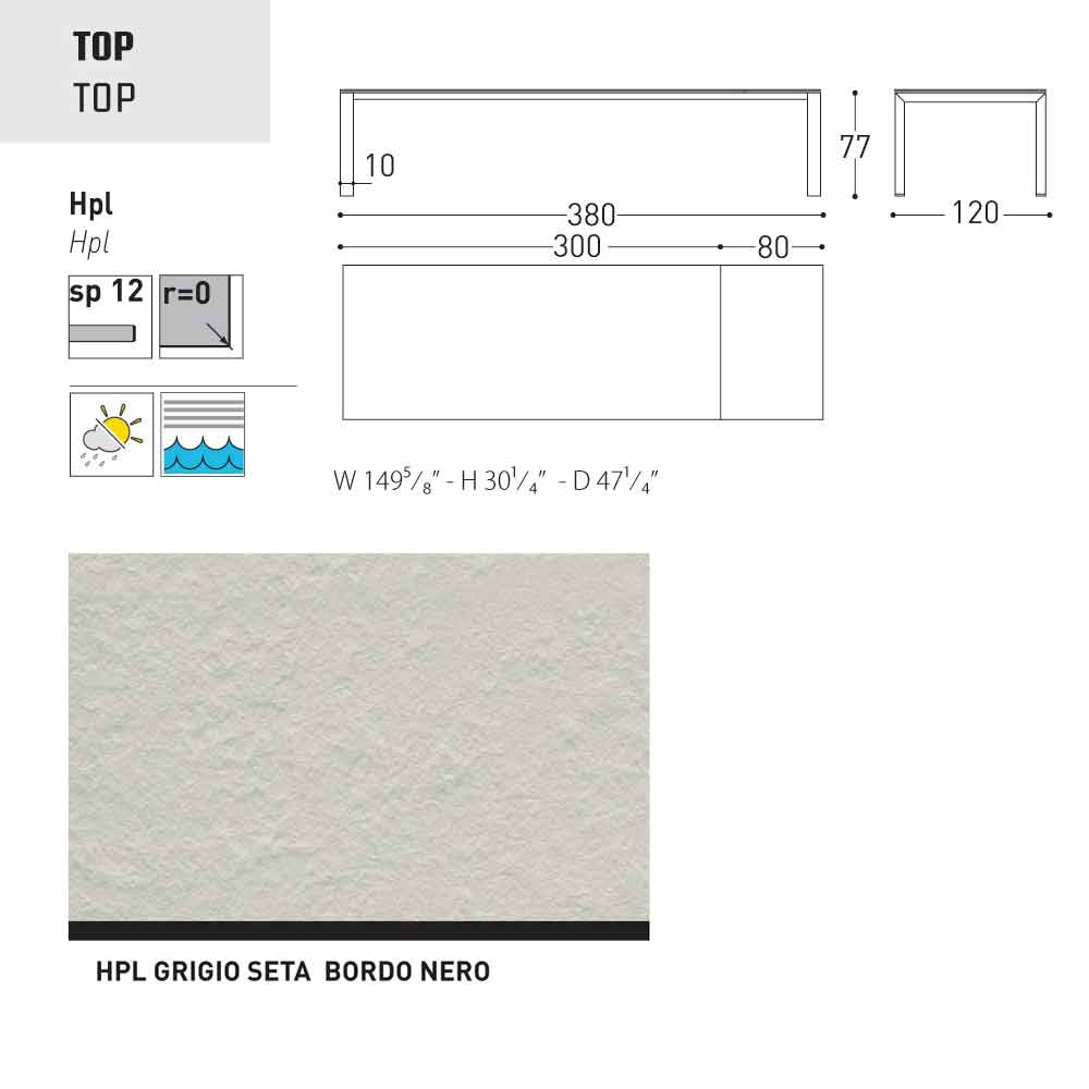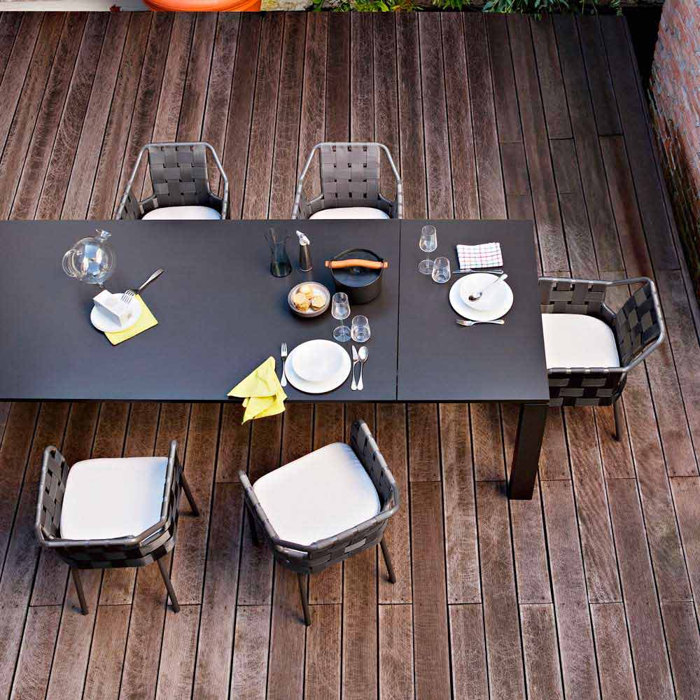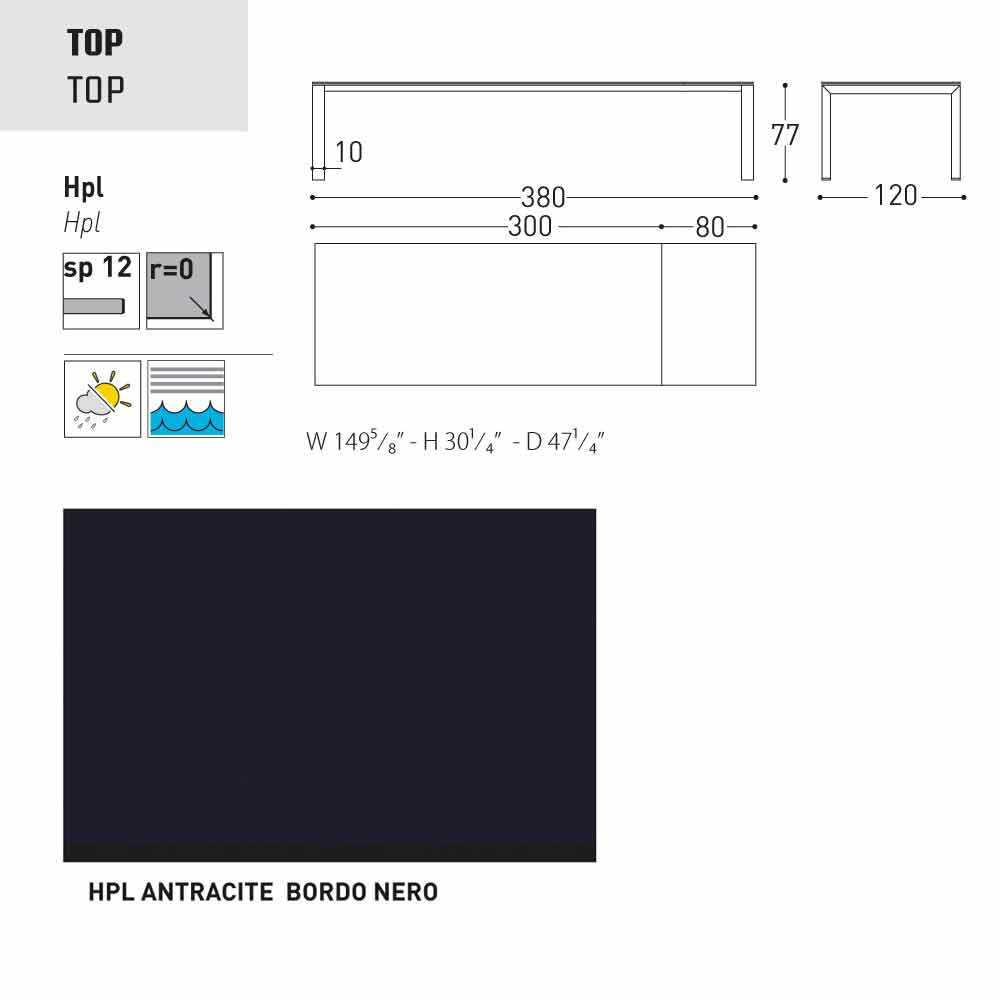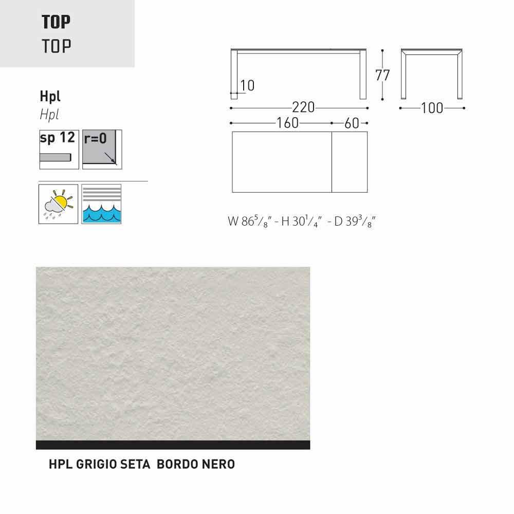 Tabelul Dolmen prezintă o structură din aluminiu vopsit si HPL, grosime 12 mm. Este un tabel cu un sistem de extensie foarte eficient în ceea ce privește mărimea, dar și pentru ușurința de mișcare. Cu un design versatil, acesta poate fi utilizat în aer liber, cum ar fi grădină, terasa, piscina, și mediile de interior.