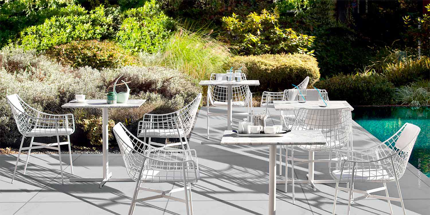 Întreținere: Colecția acceptă lumina soarelui și ploaia. Vă recomandăm întreținerea regulată și o atenție deosebită protecției obiectelor în caz de condiții meteorologice nefavorabile (gheață, grindină, schimbări de temperatură, umiditate, persistență, căldură aprinsă sau frig extrem). Durata și integritatea acestor elemente depind de îngrijirea cu care sunt menținute. Pentru produsele din aluminiu și oțel, deși protejate de tratamente și finisaje adecvate pentru utilizare în exterior, este esențial să se prevină stagnarea apei în interiorul produsului în sine. De fapt, toate articolele au găuri tehnice necesare pentru aplicarea tratamentelor și a finisajelor de protecție. Introducerea apei în aceste găuri și stagnarea acesteia pot provoca rugină în interiorul conductelor.
